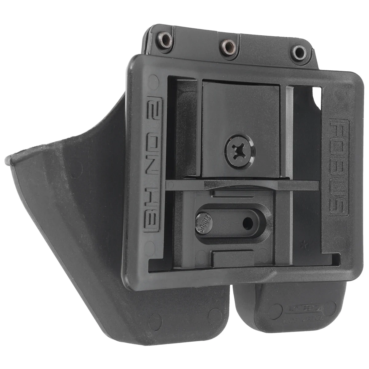 Open Fobus pouch for double-stack 9mm or .40 caliber pistol magazines and chain-link metal handcuffs. Compatible with Glock models: 17, 19, 22, 23, 26, 27, 31, 32, 33, 34, 35, 37, 38, and 39. Also fits Heckler & Koch USP and USP Compact. Constructed from RX18 Polymer, injection-molded from scratch-resistant, impact-resistant, and high-density plastic capable of withstanding extreme temperatures.