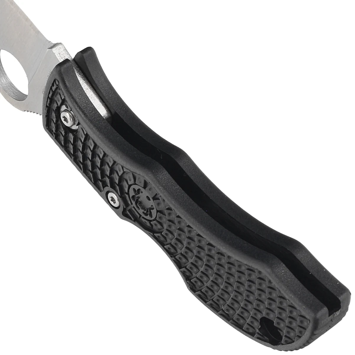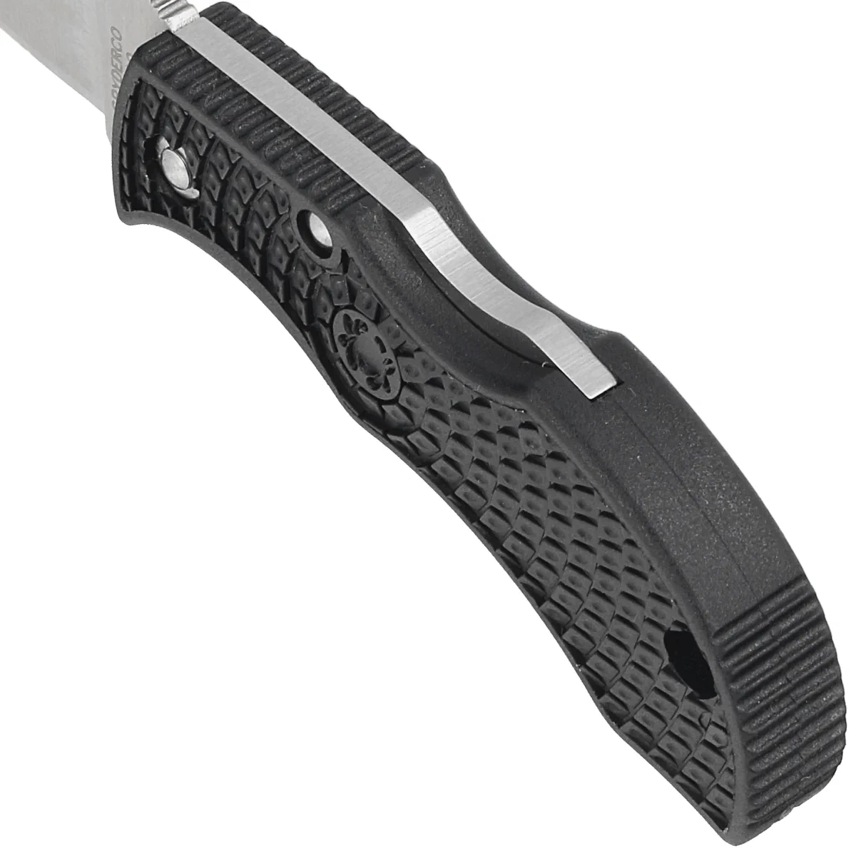 Blade - with a modified Leaf profile modeled after the shape of a bamboo leaf. Made of Japanese VG-10 stainless steel (easy to sharpen, holds sharpness well). The blade is hardened between 59-61 HRC. Plain blade was derived with a Full Flat Grind. This grind reduced the weight of the knife and improved the cutting properties. Satin (semi-matte) finish eliminates glare. The SpyderHole round cutout (Spyderco patent) allows the knife to be opened with the thumb. Solid Back-Lock with additional Boye Detent cutout to prevent accidental release of the lock when gripping the knife firmly. Notched thumb ramp.