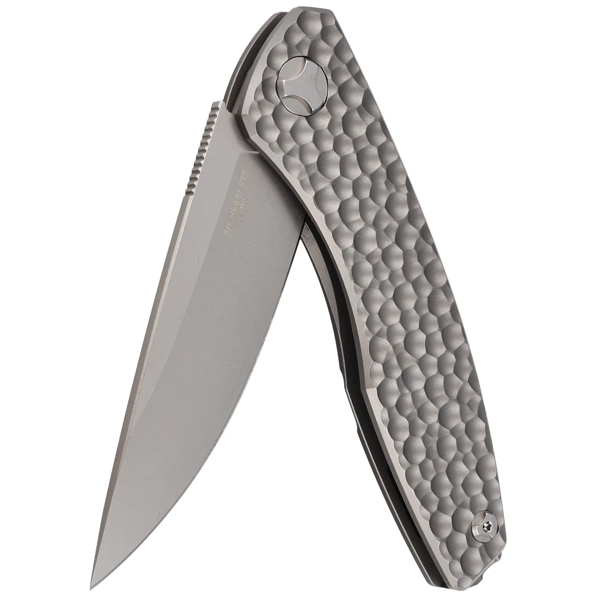 Handle - TC4 titanium grips. The chamfered edges of the coverplates eliminate sharp edges and the pea-shaped texture of the grips improves grip security. The solid backspacer to which the grips are attached guarantees the rigidity and strength of the entire construction. The simple, robust design ensures many years of use. The two-position (right/left) deep carry clip allows you to carry the knife discreetly in your pocket in the tip-up position (blade tip up).
