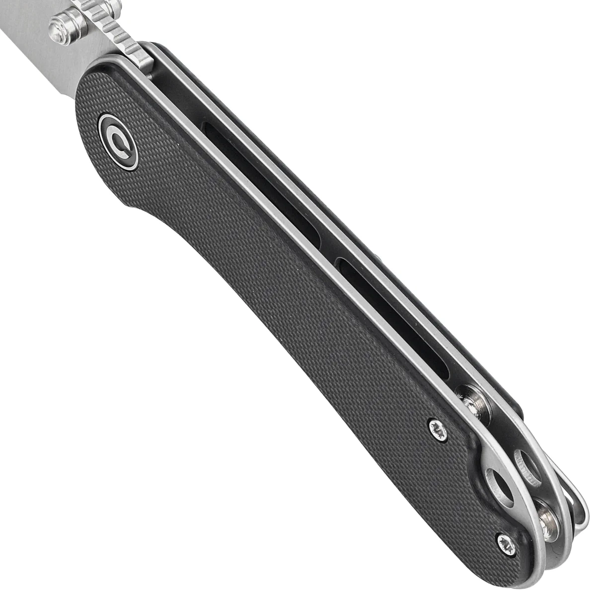 Handle - G10 plastic grips, textured in an intricate "3D cube" pattern (Textured Grabby G1) for improved grip security. The whole thing is attached to steel liners. In practice, this means many years of service without weakening the structure. The so-called open-backed design without the typical backspacer, attached to each other with steel spacers for easy cleaning in the field. The pivot axis is decorated with a stylized Civivi brand logo. A right-side metal deep-carry clip allows you to carry the knife discreetly in your pocket in tip-up (blade up) position. Above the clip a lanyard hole, an oval hole for a cord.