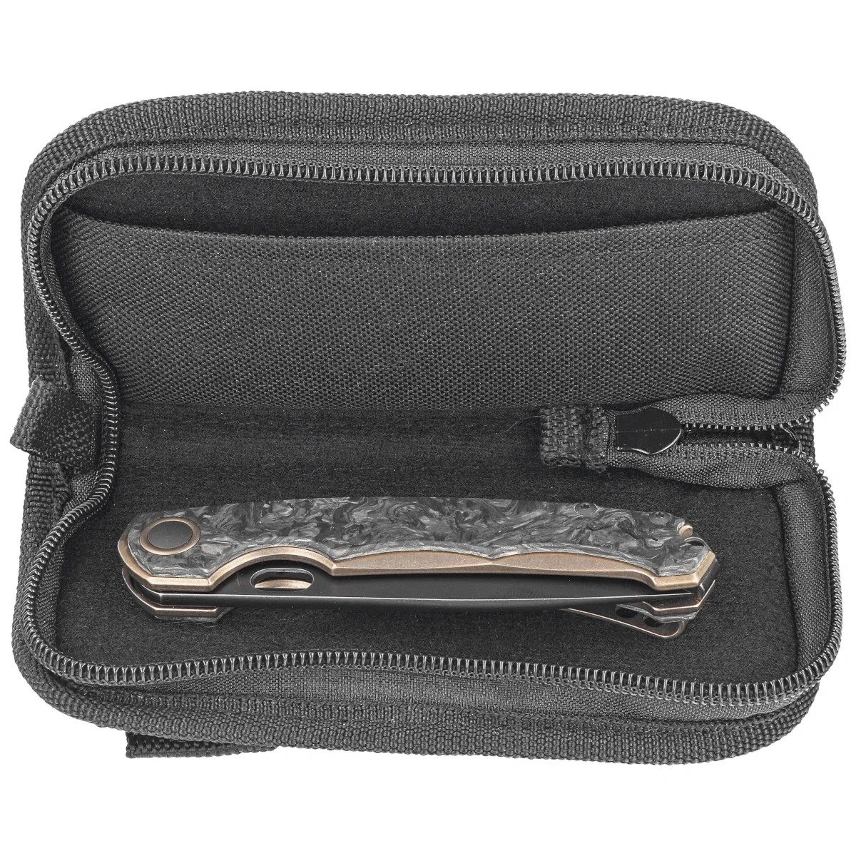 Handle - made of CNC-milled solid titanium Gr.5 Ti6AI4V finished with a layer of Marble Carbon Fiber. Chamfered cover edges eliminate sharp edges for comfortable grip. Solid backspacer provides rigidity and robustness to the overall construction. The single-position (right) deep carry clip allows the knife to be carried in the tip-up position, with the tip of the blade upwards. Above the clip a hole for threading a safety or decorative cord.