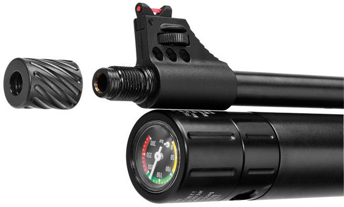 Power supply - replaceable compressed air tank with a capacity of 255 cc. A fully charged cartridge allows you to shoot from 25 to 30 effective shots depending on the caliber of the wind gun (data for version FAC*). Built-in pressure gauge allows you to control the pressure present in the tank, and thus the degree of its charge. Rotating ring protects the charging inlet from damage. After the compressed air is emptied, the empty cartridge can be replaced with a new filled one (optional). This provides an excellent solution for those not intending to take the pCP pumps or cylinders range. 130 bar minimum working pressure in the cartridge recommended by the manufacturer.