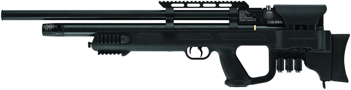 • Gladius powerful Hatsan bullpup PCP air rifle with regulator. 6-stage adjustment of the shotgun's discharge energy according to the need or distance. By using a flaskless system, compact dimensions were achieved while maintaining the normal barrel length
