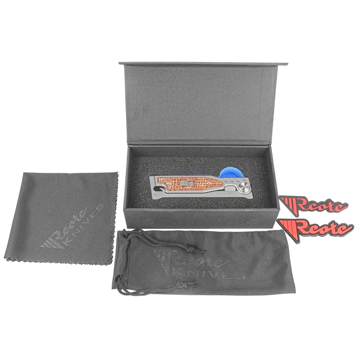 Handle - CNC-milled titanium Exoskeleton, an external skeleton with a movable top section responsible for opening and closing the knife. The chamfered edges of the sheaths eliminate sharp edges, and the perfectly matched Burlap micarta inlays add an exclusive touch and improve grip security. On the right side, an artful sliding lock slider for advancing/retracting the blade. Once it is moved to the secure "lock" position, the knife will not be opened/closed by accident. A single-position titanium (right) deep-carry clip allows you to discreetly carry the knife in your pocket in tip-down position (blade tip down).