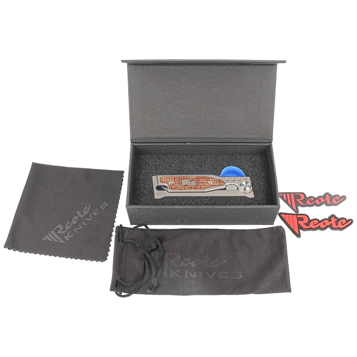 Mini EXO OTF Gravity Drop Point Bead Blasted Titanium/Burlap Micarta, Stonewashed ingenious EXO folding knife from the legendary Reate Knives manufactory, a display of engineering in design. Gravity OTF (Out The Front) Blade extends from the front due to the force of gravity. Modeled on the design of the Luftwaffe gravity air knife, commonly known as the knife of German paratroopers. Intuitive blade ejection / retraction with one hand (under the influence of gravity) and the best materials, perfectly combined with the unmatched quality of the Reate brand!