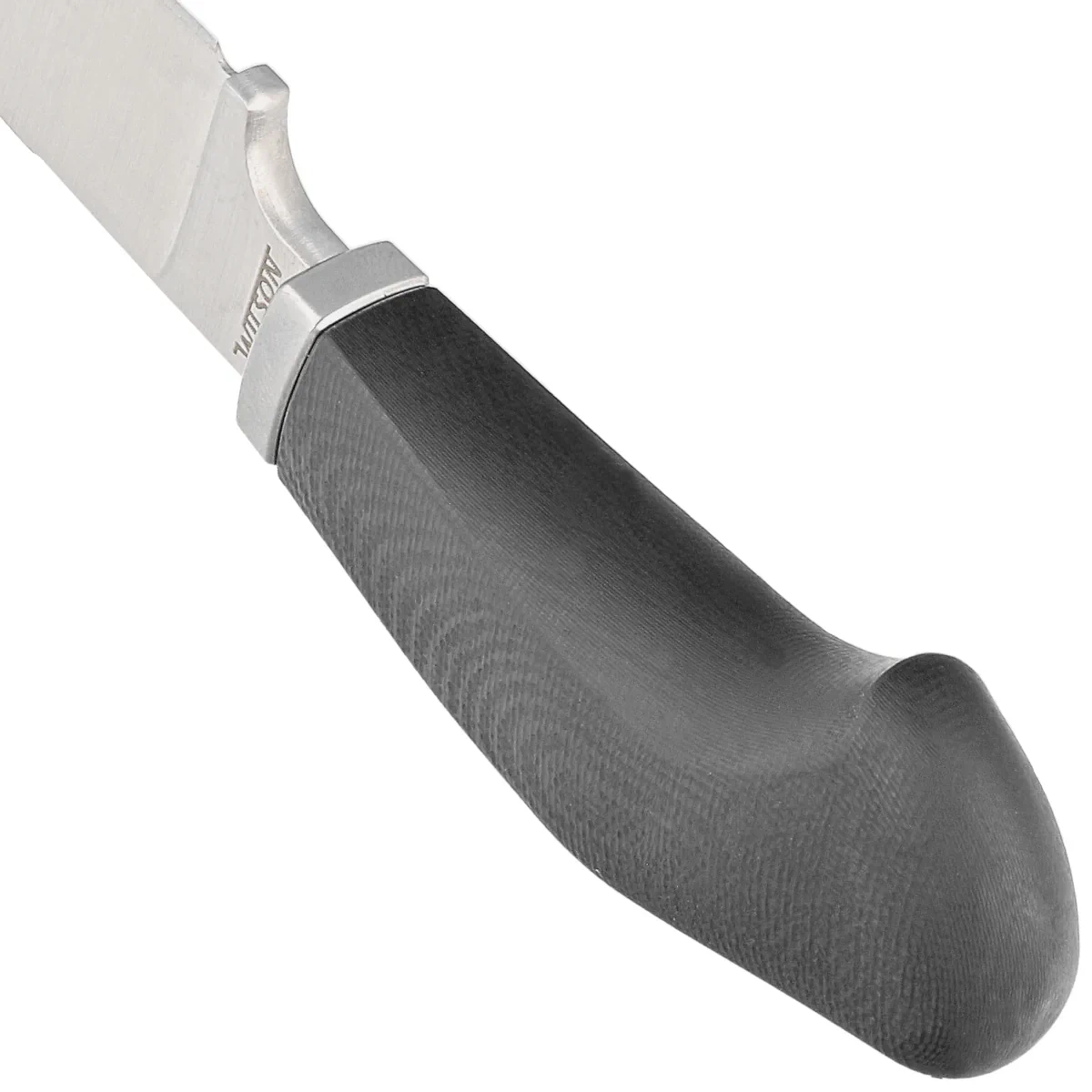 Blade - extremely sharp with Drop Point profile, with marked belly, ideal for all kinds of work. The satin-smooth Plain blade is derived with a high Flat Grind, the high grind gives excellent cutting edge geometry and extreme cutting performance. The enlarged hilt protects the hand from slipping on the blade.