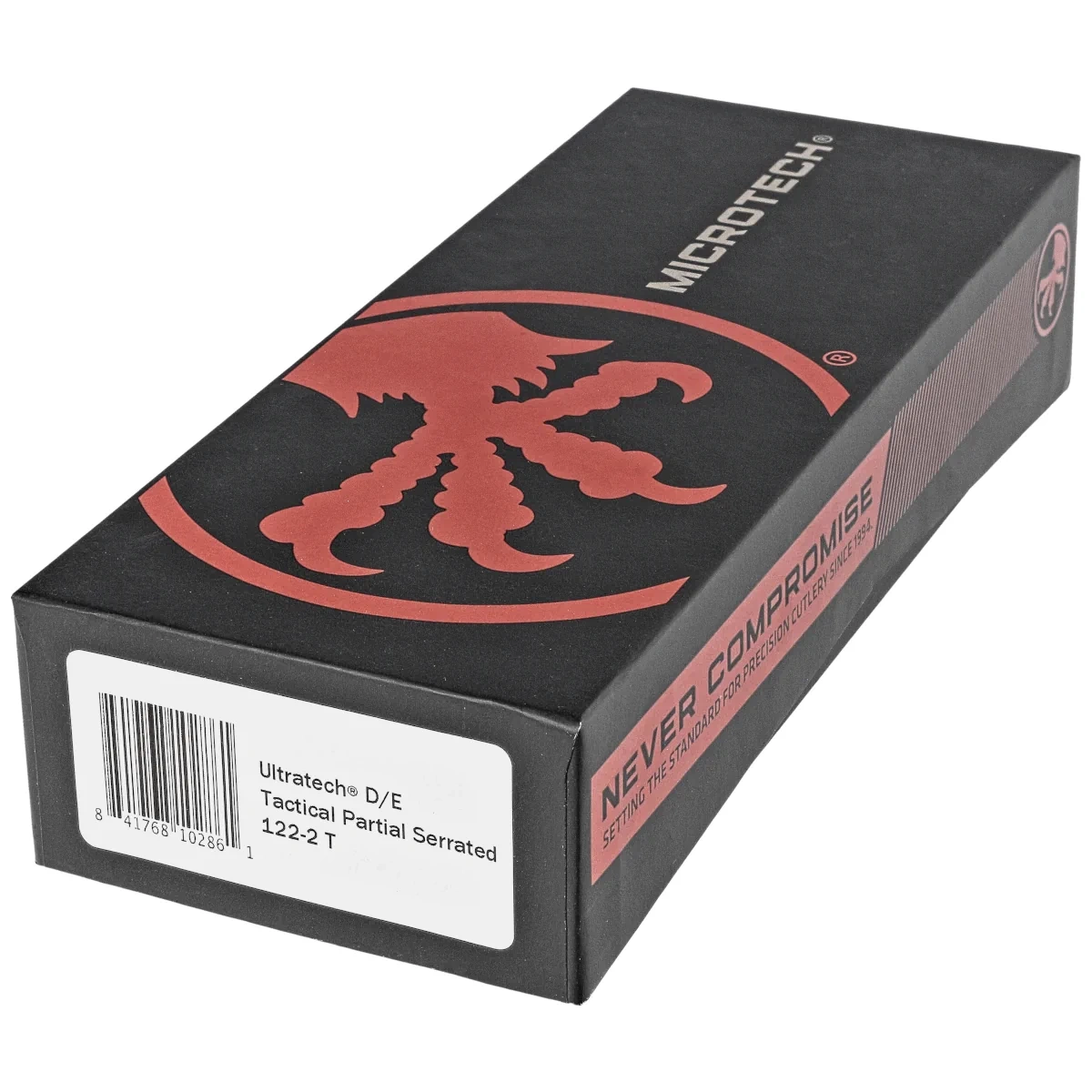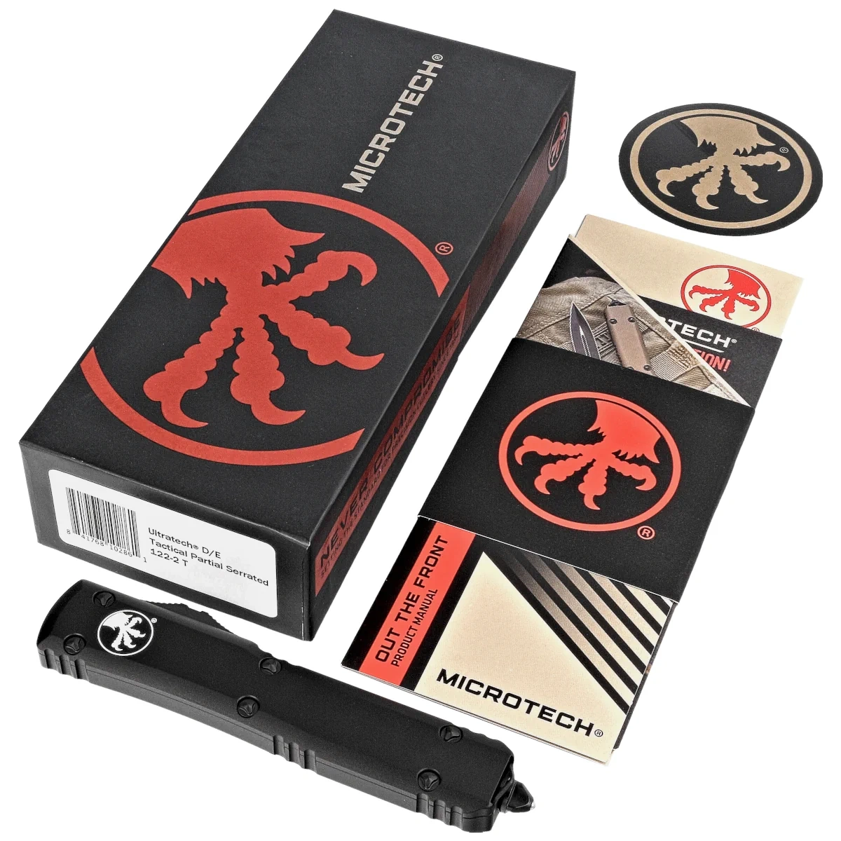 Ultratech D/E Black Aluminum, Tactical P/S is a full-size OTF (Out The Front) automatic knife from Ultratech , featuring a tactical blade finish. Equipped with a hellishly fast mechanism that extends a razor-sharp blade in a striking Two-Tone finish. 100% made and assembled in the USA. Designed by Anthony Marfione, knifemaker and owner of Microtech Knives.