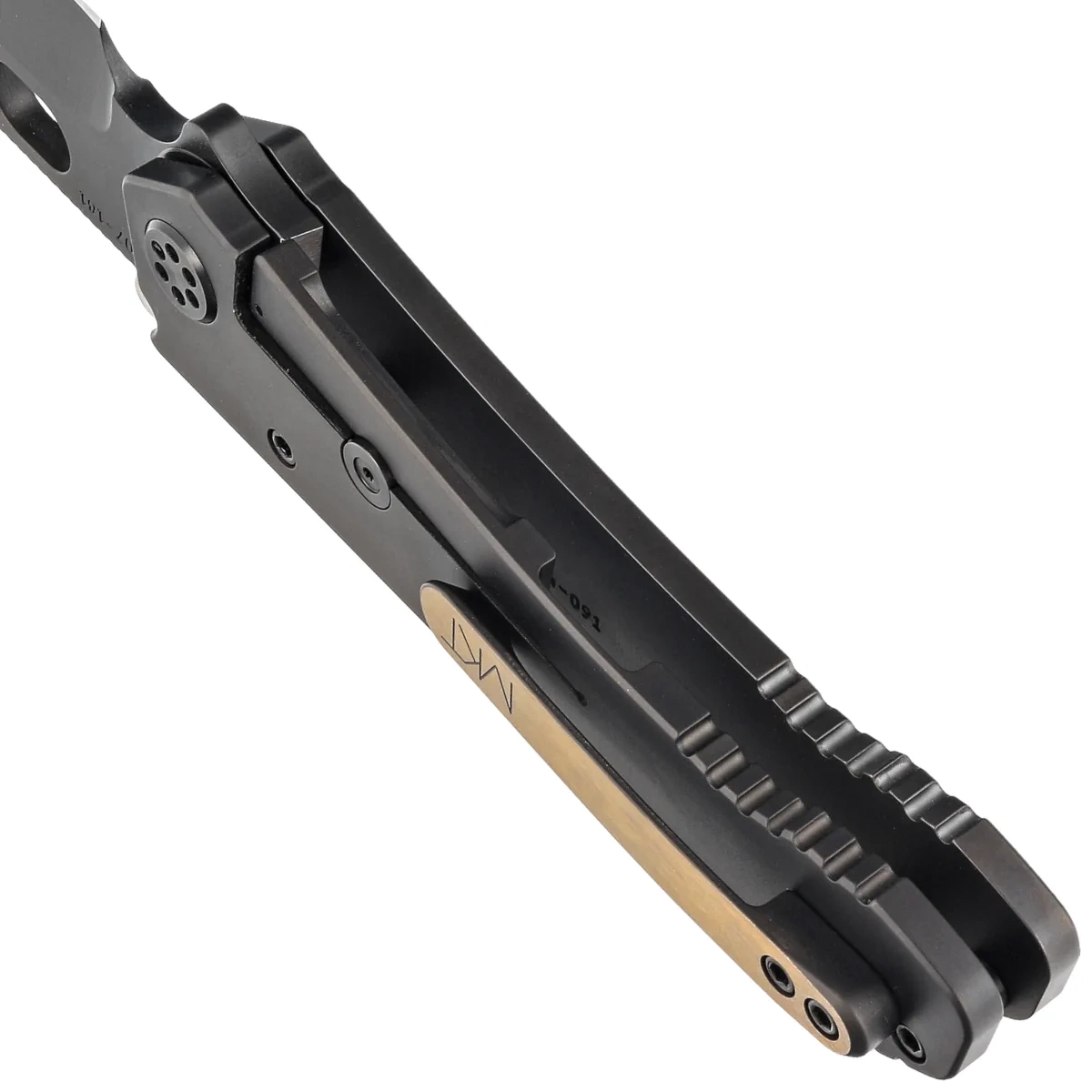 Blade - with Drop Point profile. In this version of the 187 DP we get a handmade concave grind, Blade coated with black PVD coating, a hole in the blade with which to open the knife. For increased insensitivity to contamination, phosphor bronze washer was used, making the pivot axis more resistant to field work. A powerful titanium frame lock bar secures the knife from folding, unfolded and secured the knife is as solid as an armored cash register.