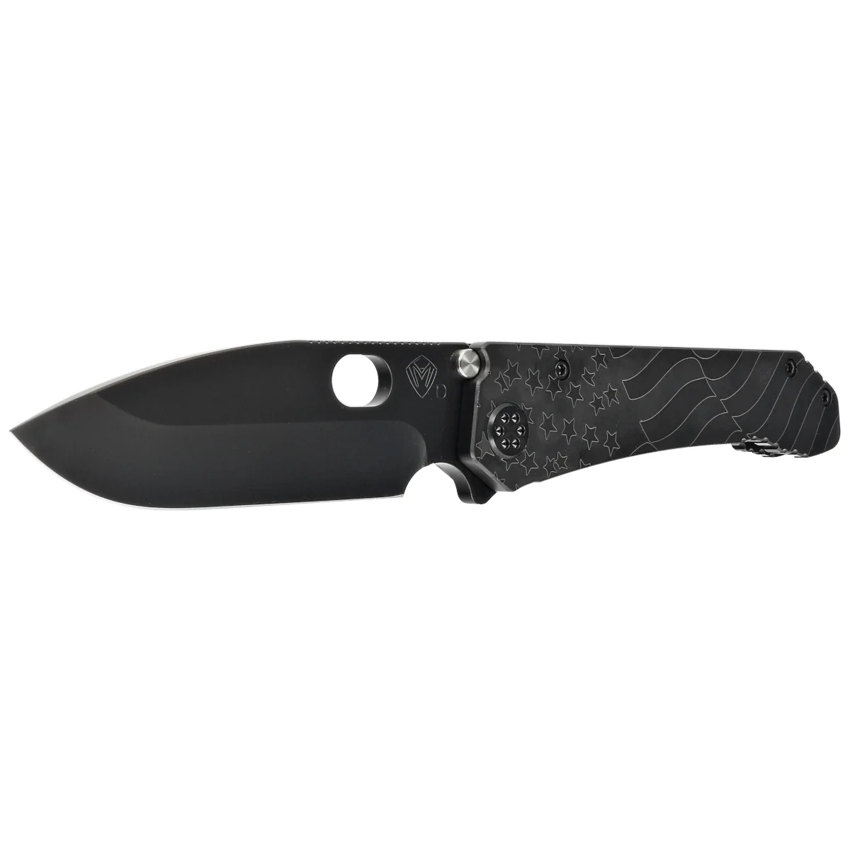 187 DP Black PVD "Ghosted Flag" Titanium, PVD HW, PVD w/Bronze Clip, Black PVD D2 is a powerfully built folding knife ideal for men with large hands and suited for almost any task where a knife is needed. It is opened with an oval hole in the blade. The concave grind on the D2 steel blade was made by hand. This is unique in the knife industry; only a few manufacturers is capable of make a concave grind by hand. When opened, a solid framelock holds the blade in place. The stop-pin has been pressed into the blade so that it rests symmetrically against the handle, which brilliantly increases durability. The knife gets its name from the thickness (0.187") of the titanium scales used in the construction of the handle. Made entirely in the USA, according to the high standards set by Medford