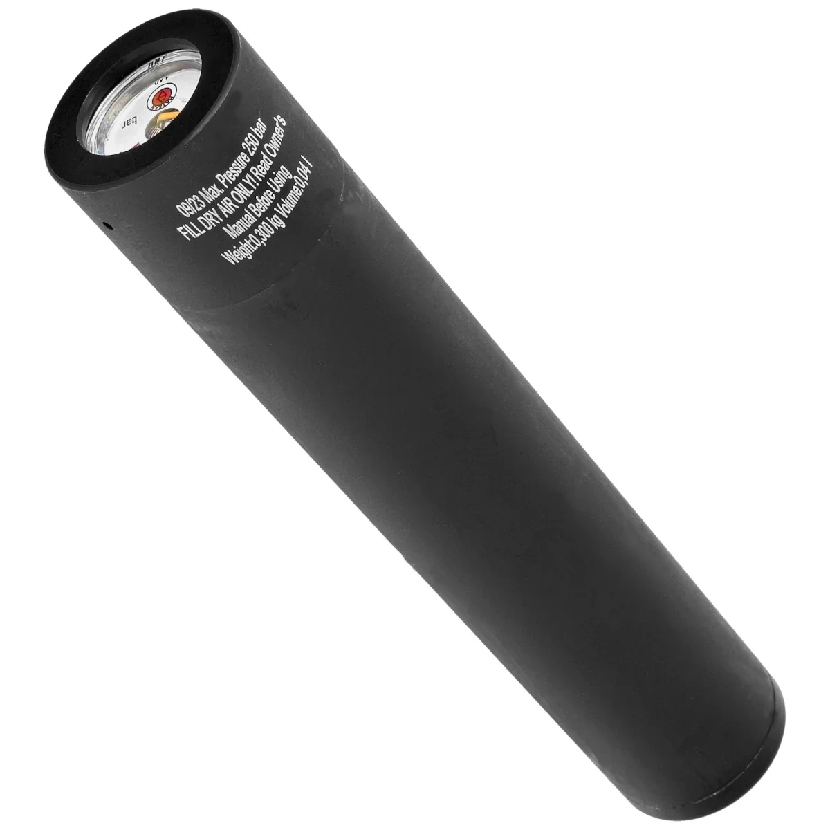 Air cylinder - made of aluminum, powered by compressed air pressure tank with a capacity of 40 cc. A fully charged cylinder allows you to fire about 52-60 shots, depending on the caliber of the windgun (data for the FAC version). The built-in pressure gauge allows you to constantly monitor the pressure in the tank, and thus the degree of its charge. A rotating cover protects the cartridge inlet from damage.