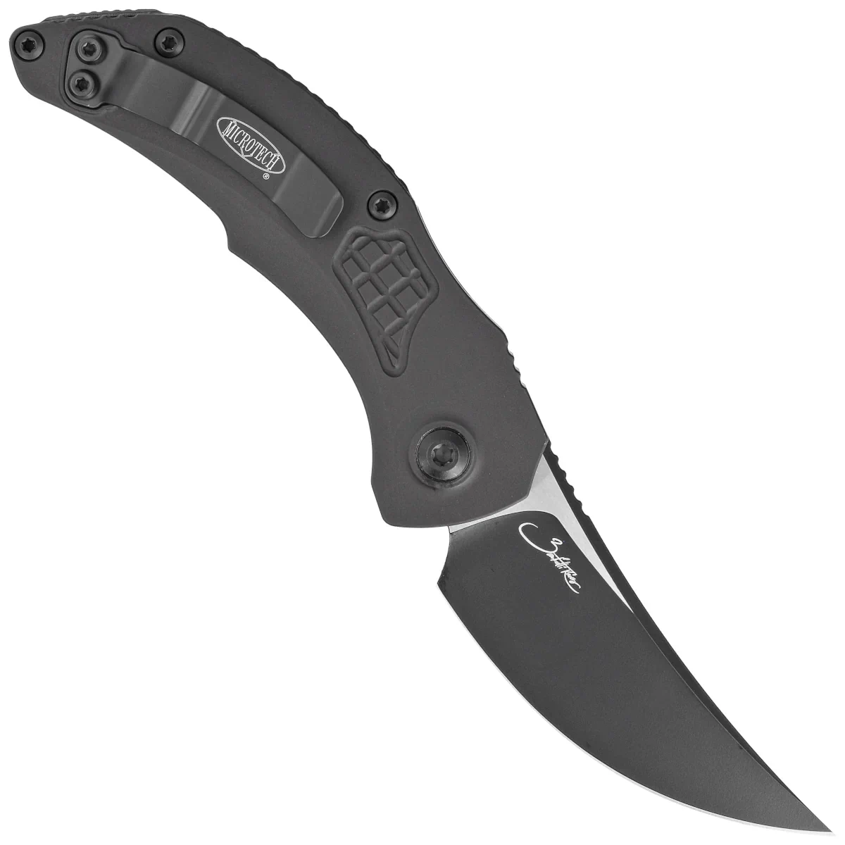 Brachial Black Aluminum, Black premium automatic folding knife with a perfectly crafted Handle that provides unparalleled comfort during use. The hand-ground and sharpened blade, folded by skilled craftsmen, provides feel and exceptional cutting capabilities. The folder combines extremely strong construction, great materials and legendary workmanship for which the iconic Microtech brand is famous. The result of a collaboration between Bastien Coves and Anthony Marfione, owner of Microtech Knives.
