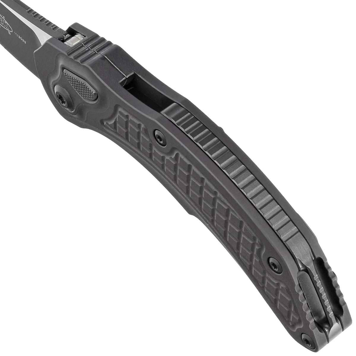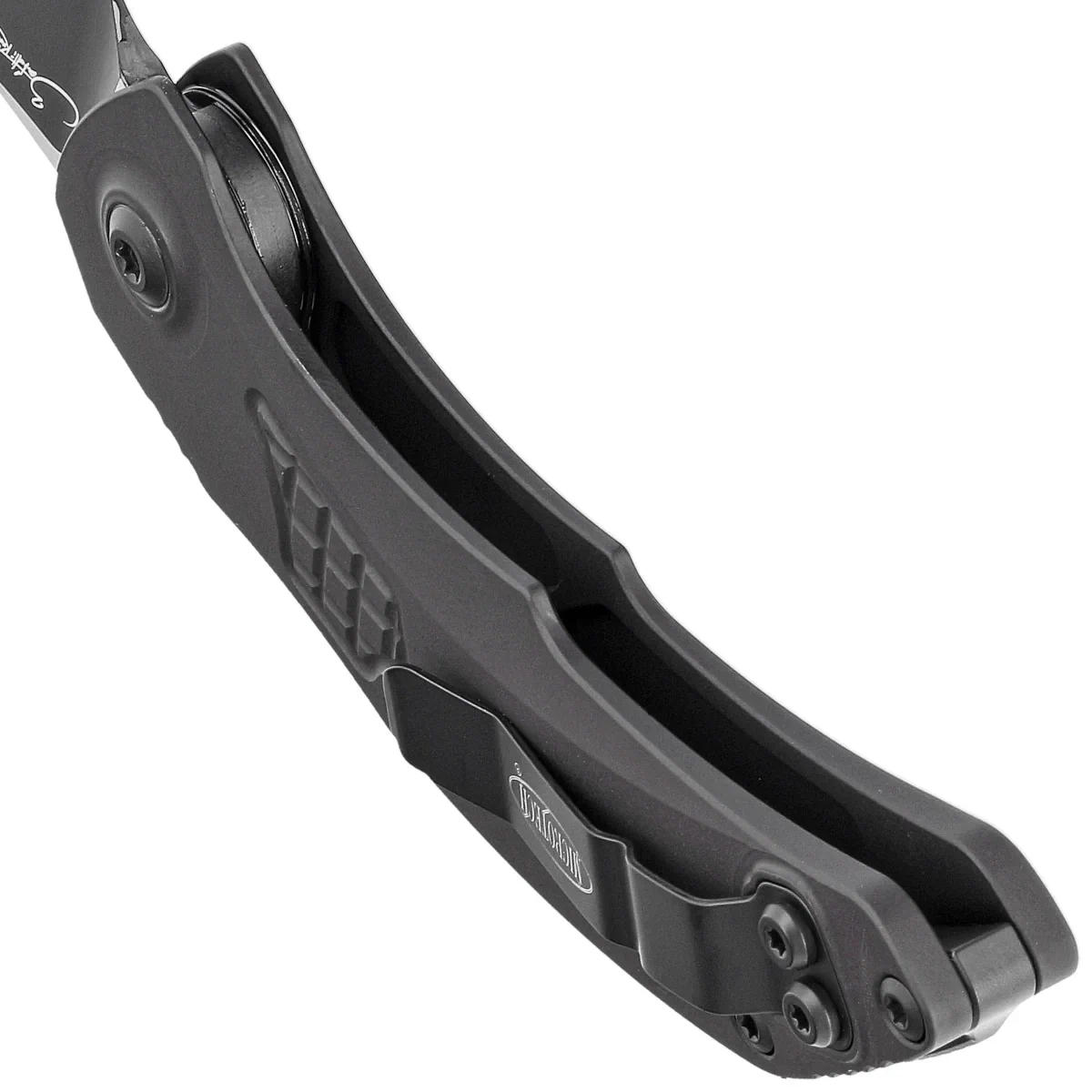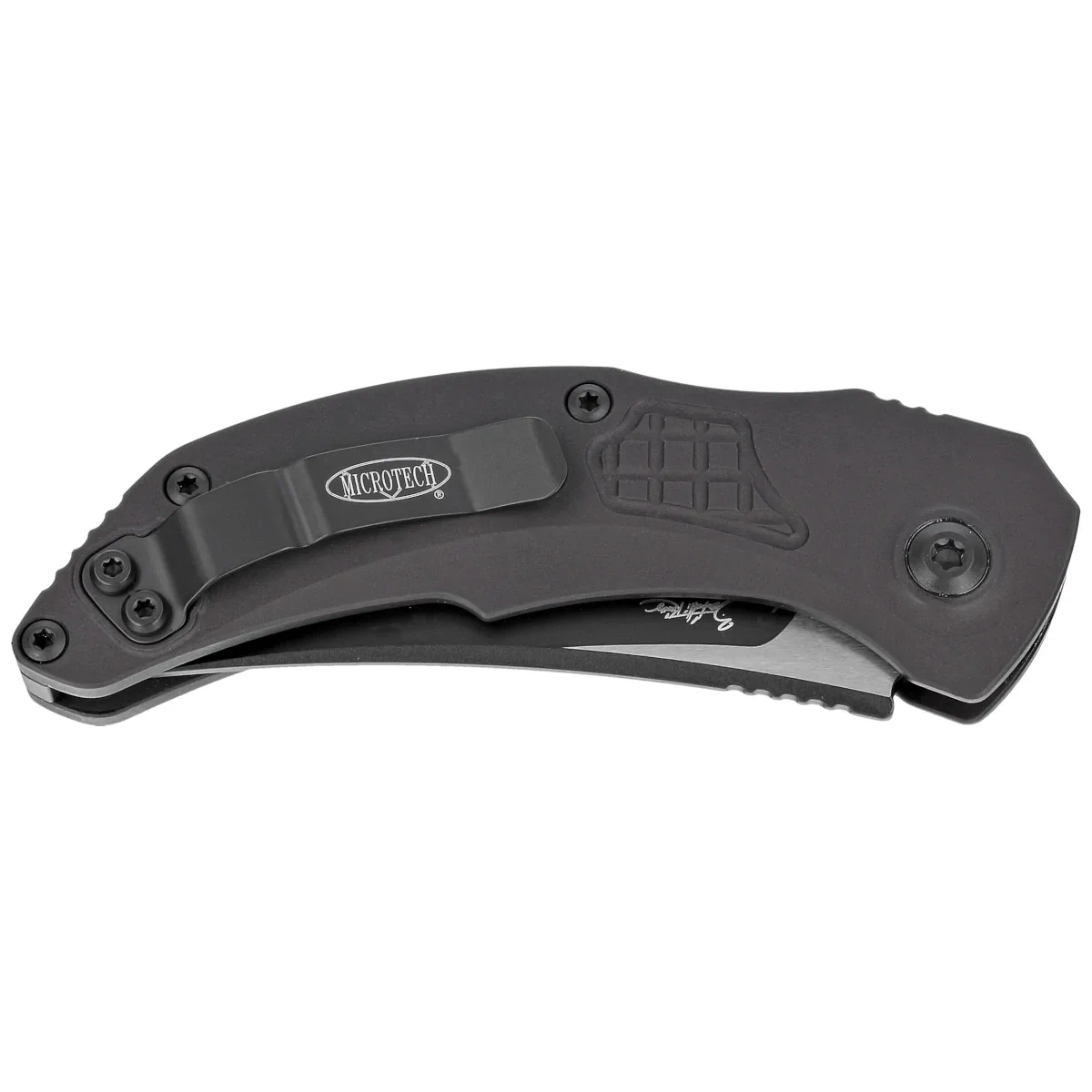 Handle - made with excellent precision in 3D technology on CNC milling machines from black anodized 6061-T6 aluminum. The texture and milling of the Handle surface makes the knife non-slip in the hand during use. There are notches (jimping) on the back of the Handle for a more secure grip. The ergonomic profile and milled single-position (right) solid clip, allow the knife to be carried discreetly in the pocket, in tip-down position (blade tip down). The clip bears the Microtech logo, serial number and production date.