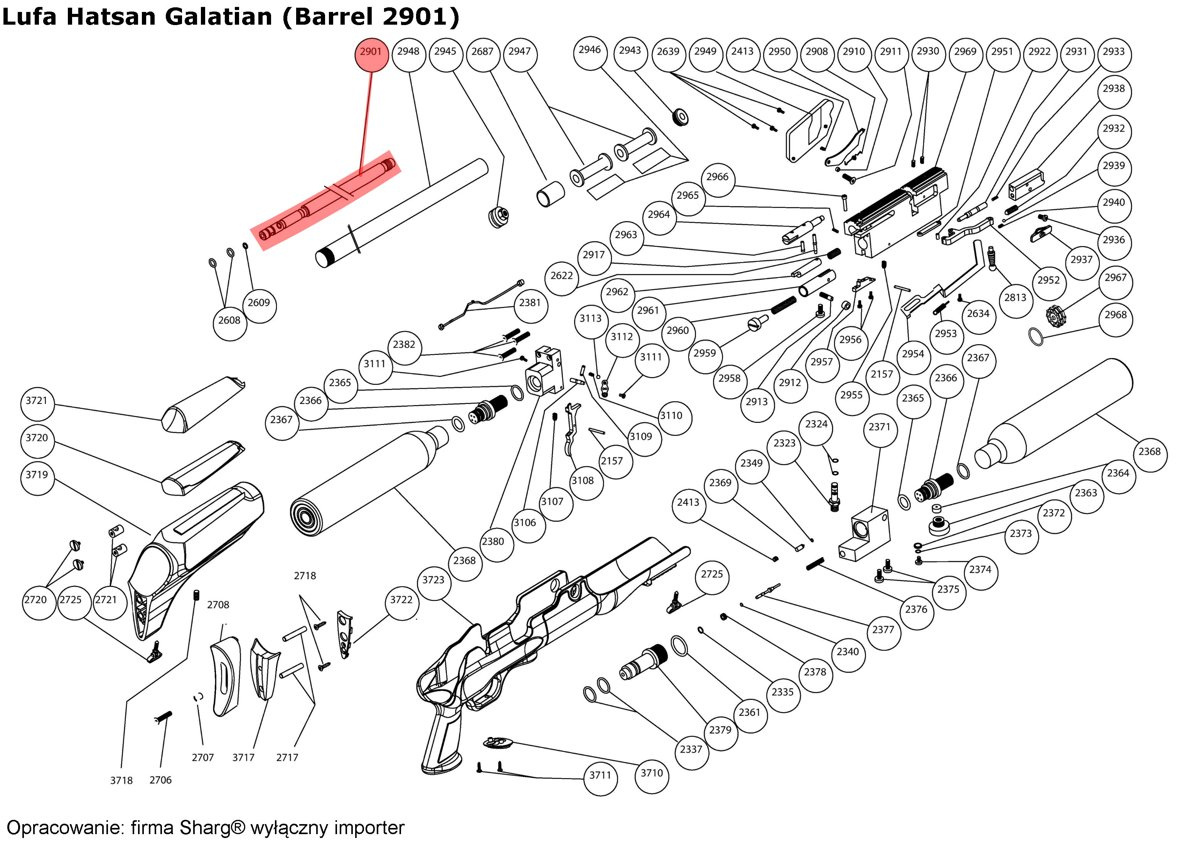 - 2901 - (service) 23" (585 mm) precision threaded barrel from Hatsan Arms. Designed for the powerful PCP Predator, Hercules and Galatian airguns. Barrels: 2901-1 caliber .177 (4.5 mm), 2901-2 caliber .22 (5.5 mm), 2901-3 caliber .25 (6.35mm).