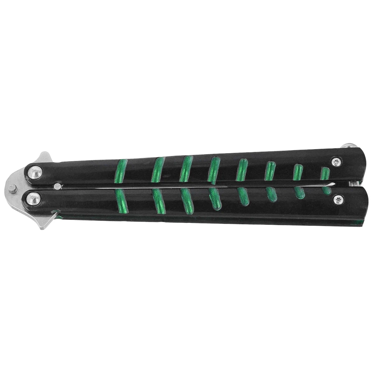 - Practicality: The folding butterfly design makes the Balisong Black / Green Stainless Steel, Satin easy to carry and store.