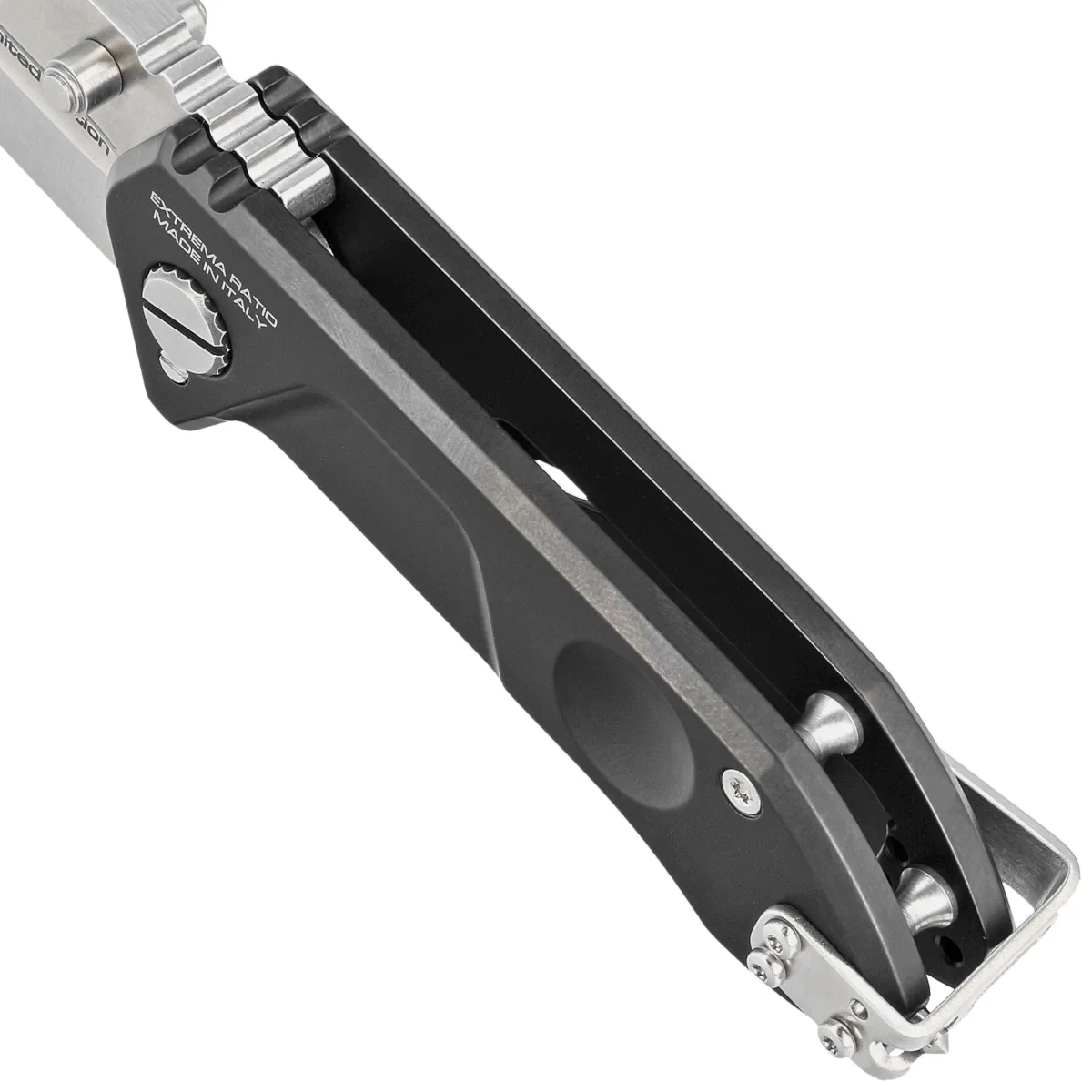 Handle - grips made of black anodized titanium. Chamfered edges of the covers eliminate sharp edges and Extrema Ratio's characteristic finger recesses improve grip security. The so-called open-backed design without the typical backspacer, fastened together with steel spacer sleeves for easy cleaning. Simple, sturdy construction provides assurance of many years of use. A two-position (right/left) steel deep-carry clip allows you to carry the knife discreetly in your pocket in tip-up position (blade tip up). Below the pivot screw is a smaller opening force adjustment screw, depending on your preference you can set yourself the amount of force needed to open the knife.