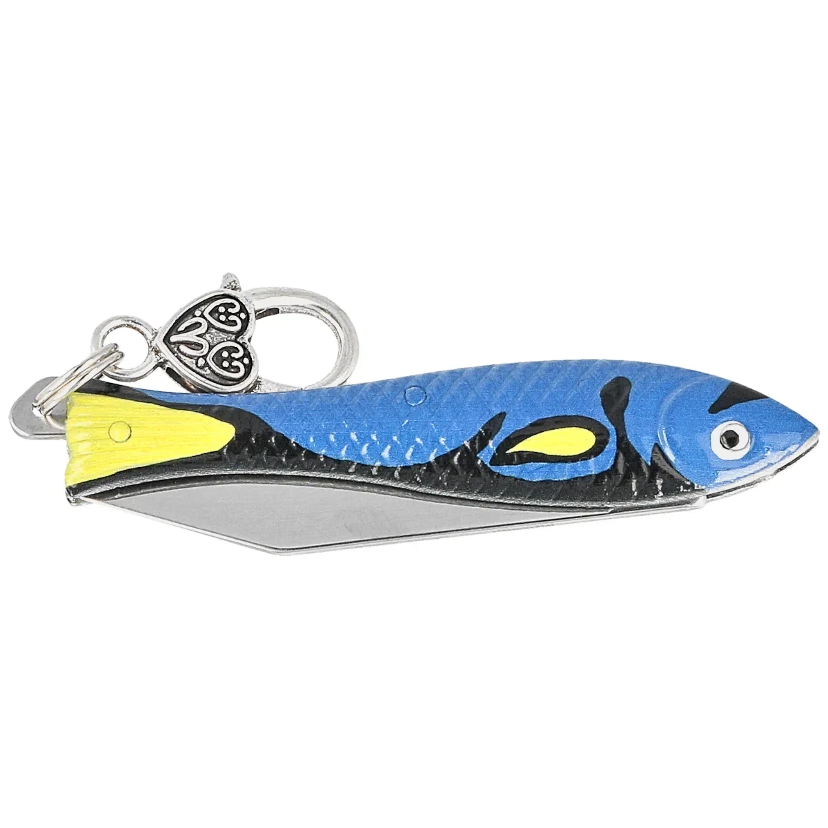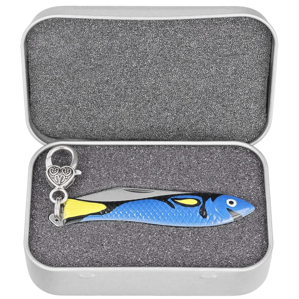 Handle - tang covers in the shape of fish scales cast in zinc alloy, decorated with the graphic motif of Dorris fish from the movie "Where's Dory?", made with the new UV LED printing technology. In the back of the grips an eyelet that allows you to attach the knife to a key ring with a bunch of keys.