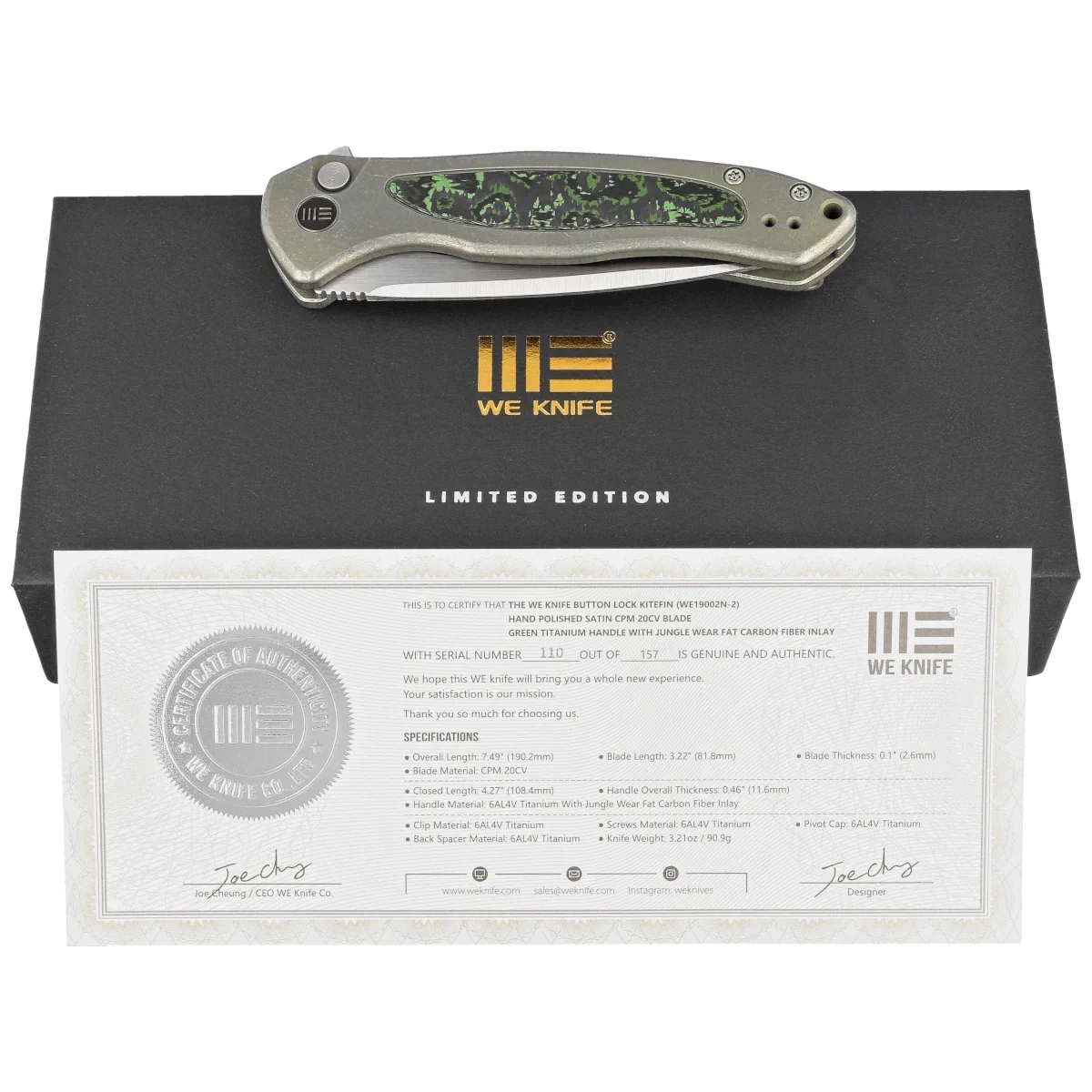 WE Knife Button Lock Kitefin LE No 000/157 Green Titanium/Jungle Wear Fat Carbon, Hand Polished Satin CPM 20CV (WE19002N-2)
