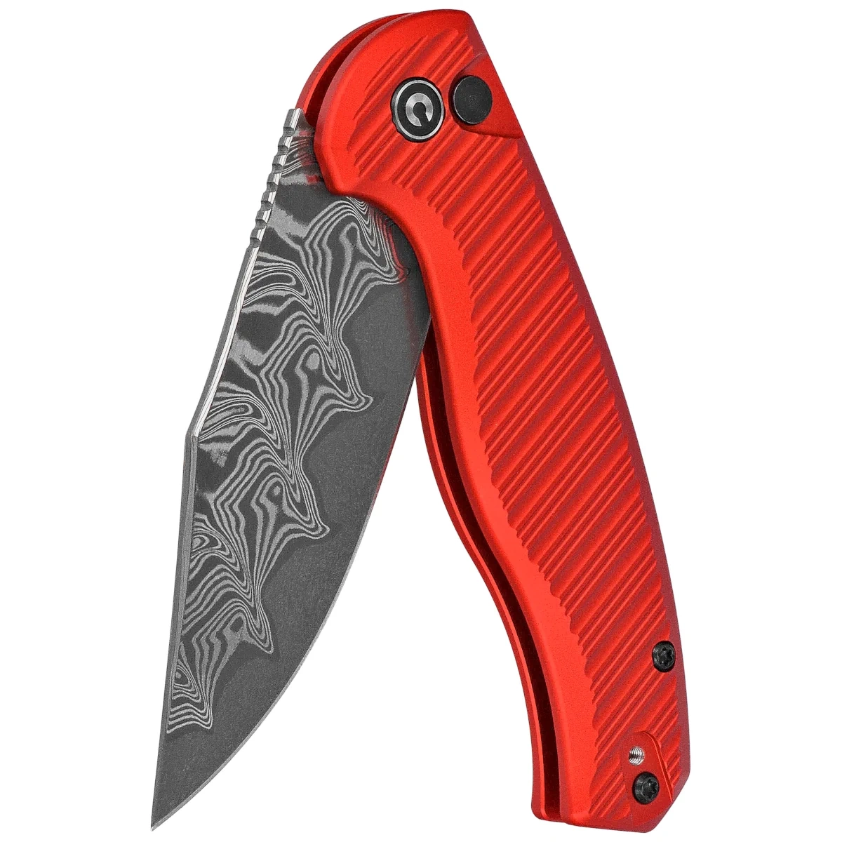 Handle - made of aluminum in red color, distinctive texture made with CNC machine tools. Chamfered edges of the covers eliminate sharp edges for comfort, and the fore finger groove made on the front improves grip security. The open-backed design, fixed with steel spacer sleeves, reduces weight and facilitates cleaning. The pivot axis is decorated with a stylized Civivi brand logo. A two-position, right/left deep carry clip allows you to carry the knife discreetly in your pocket in tip-up position (blade tip up).