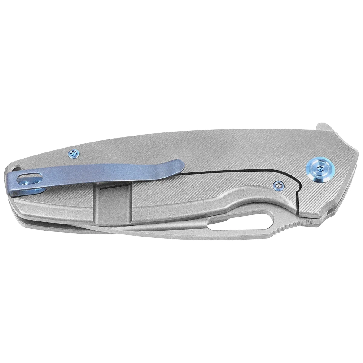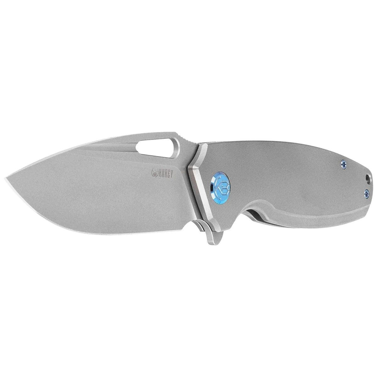 Handle - is two pieces of solid gray titanium 6AL4V finished with fine texture on CNC milling machines. The chamfered edges of the covers eliminate sharp edges for comfort and improve grip security.The open-backed design, so called, fastened together with steel spacers, reduces weight and facilitates cleaning. The simple, sturdy design provides assurance of many years of use. Deep finger undercut (fore finger groove) improves grip security. The pivot axis is decorated with a stylized Kubey Knife brand logo. A single-position (right) titanium deep-carry clip allows you to carry the knife discreetly in your pocket in tip-up position. Above the clip a lanyard hole, a hole for threading a safety or decorative cord.