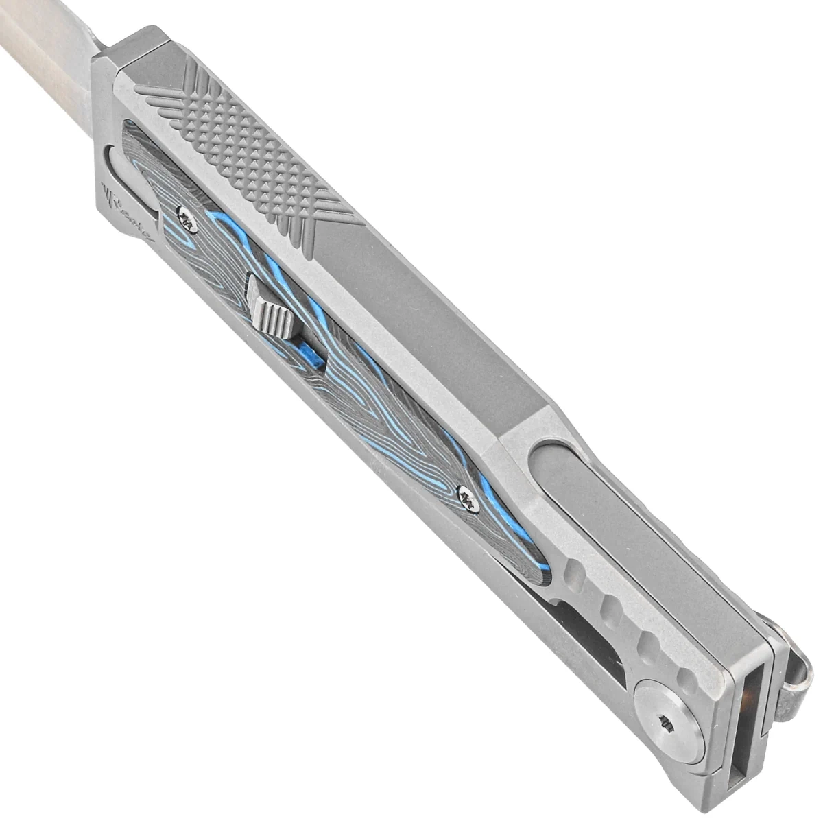 Handle – CNC-machined, titanium Exoskeleton construction. The external frame features a movable upper section responsible for opening and closing the knife. The chamfered edges of the sheaths eliminate sharp edges, and the perfectly matched G10 composite inlays in the unique Damascus pattern add an exclusive touch and improve grip security. On the right side, an artful sliding lock slider for advancing/retracting the blade. Once it is moved to the secure "lock" position, the knife will not be opened/closed by accident. A single-position titanium deep-carry clip (right side) allows discreet pocket carry in a tip-down orientation (blade tip pointing down).