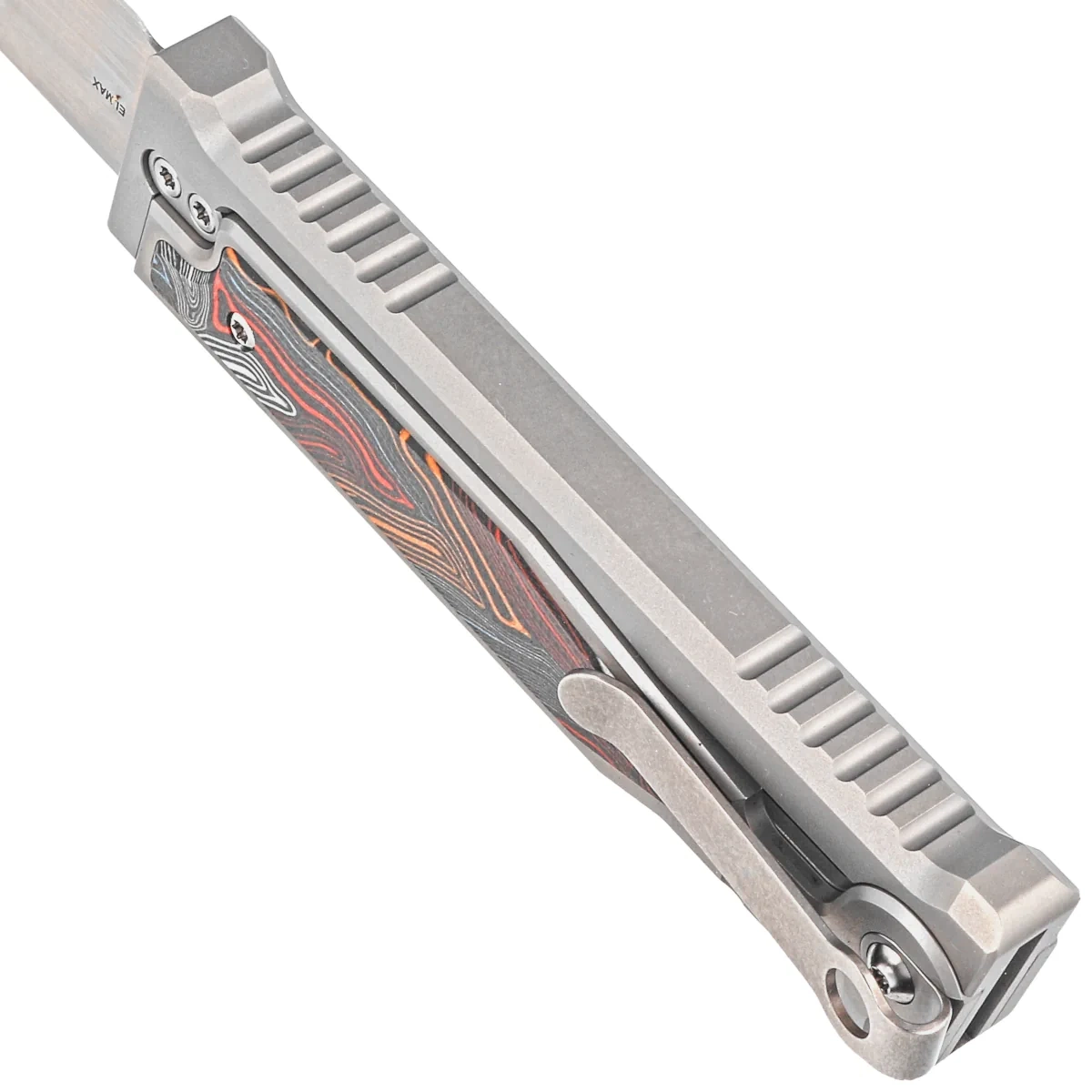 Handle – CNC-machined, titanium Exoskeleton construction. The external frame features a movable upper section responsible for opening and closing the knife. The chamfered edges of the sheaths eliminate sharp edges, and the perfectly matched G10 composite inlays in the unique Damascus pattern add an exclusive touch and improve grip security. On the right side, there is a finely crafted sliding lock slider for blade deployment and retraction. When shifted into the safe “lock” position, the knife cannot open or close accidentally. A single-position titanium deep-carry clip (right side) allows discreet pocket carry in a tip-down orientation (blade tip pointing down).