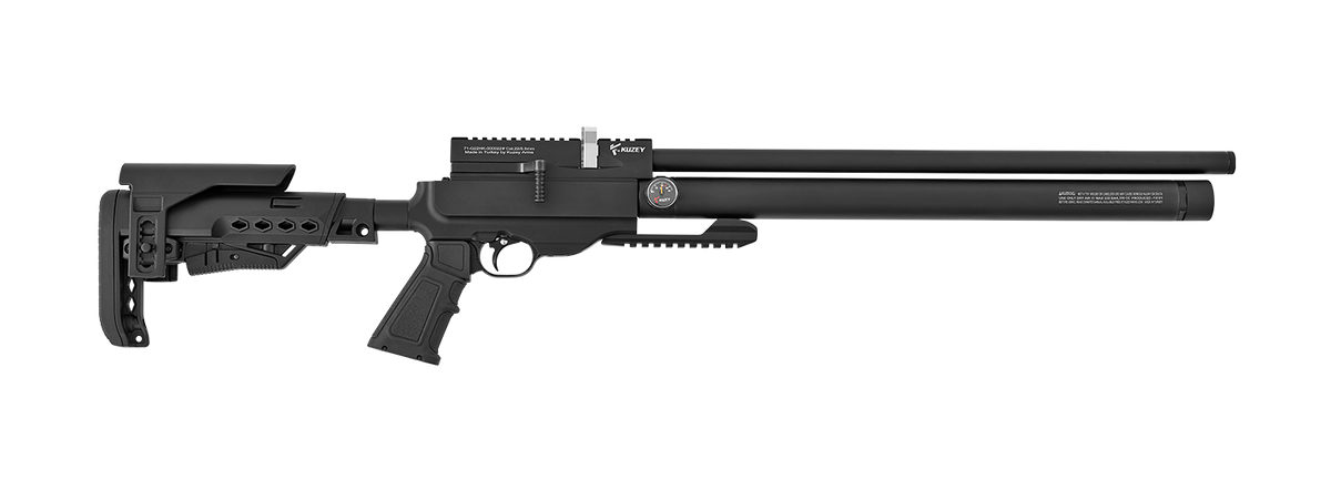 - Kuzey K600 Tact 5.5 mm – modern PCP air rifle with adjustable shot power and integrated silencer. Tactical stock with telescopic buttstock and adjustable cheek rest. Available in calibers 4.5 mm, 5.5 mm, and 6.35 mm.