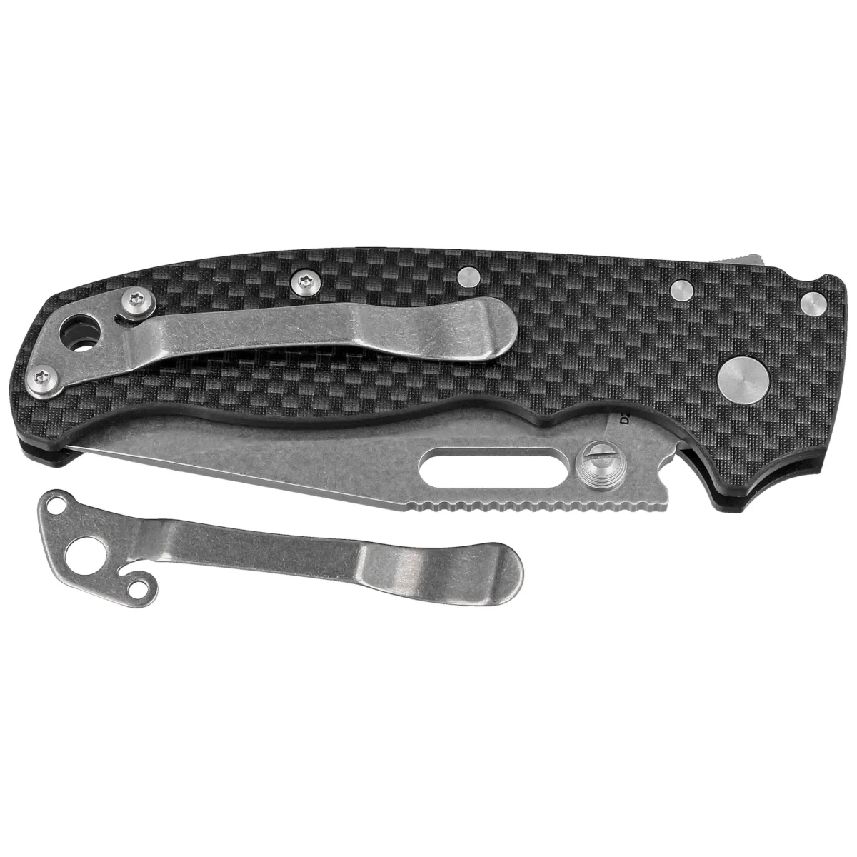 Handle - grips made of Carbon Fiber, a virtually indestructible plastic that is insensitive to weather conditions, resistant to chemicals and mechanical damage. Chamfered edges of the covers eliminate sharp edges and characteristic surface texturing improves grip confidence. A single-position, right-handed clip allows the knife to be carried in the tip-up position, with the tip of the blade upward. A left-handed clip is included.