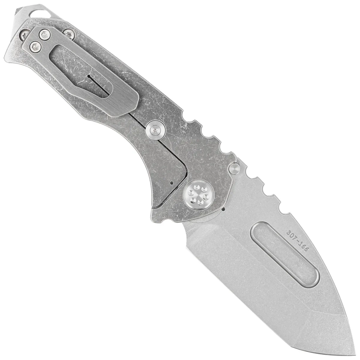 Handle - made from solid titanium, also finished with a machine-applied "tumbled" technique. All Praetorian variants are equipped with a D2 hardened steel backspacer, coated with NP3 which is also a glass breaker. MKT has thoroughly tested these backspacers and found that they are completely reliable and 100% functional. No tricks. There will be no other variants of this backspacer, in a different material or shape, as it is meant to save lives in an emergency, not for decoration. Wear hand and arm protection when testing, as excessive impact force will ALWAYS cause cuts! The whole thing is completed with a solid, clip, also made of titanium, of course.