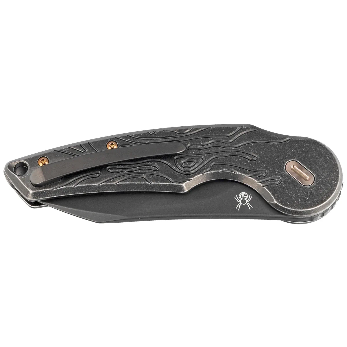 Handle - is thick pieces of 6AL4V titanium subjected to a bath in fine Stonewashed pebbles and then coated with black PVD coating, beautifully milled using CNC machine tools. A solid titanium backspacer gives the whole structure the desired rigidity. The simplicity and solidity of the construction give the assurance of many years of use. The single-position clip (right), made of titanium, allows the knife to be carried in tip-up position. Above the clip a lanyard hole, a hole for threading a decorative or security cord.