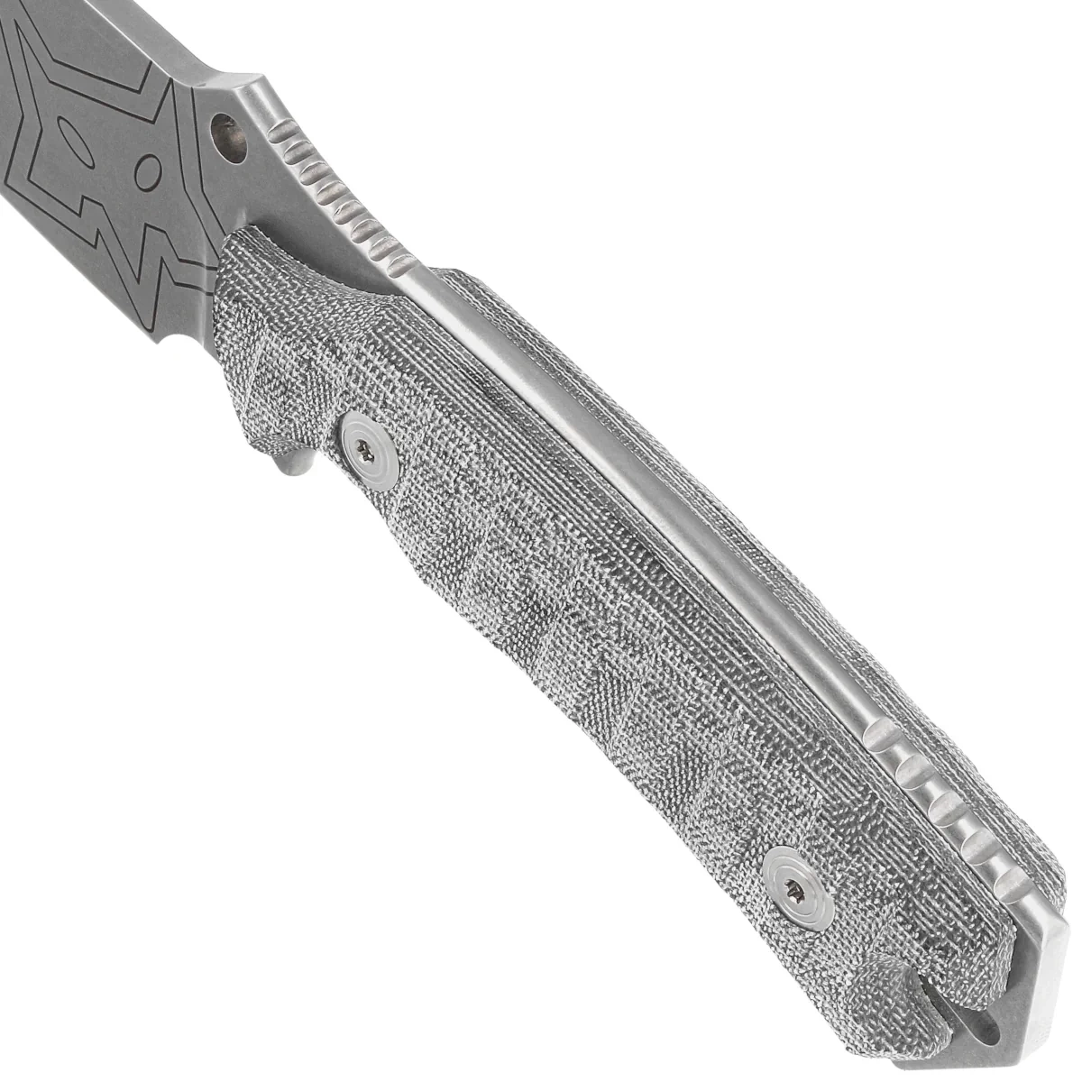 Handle - profiled grips made of Micarta, a virtually indestructible plastic that is insensitive to weather conditions, resistant to chemicals and mechanical damage. The chamfered edges of the covers eliminate sharp edges and the textured and textured surface improves grip confidence. The grip covers are attached to the shank with Torx screws. Fore Finger Groove, a deep cut under the finger prevents the hand from accidentally slipping on the blade. In the back, a protruding section of the tang can be used as an improvised hammer or glass breaker. It is also used to strike sparks from a magnesium flint.
