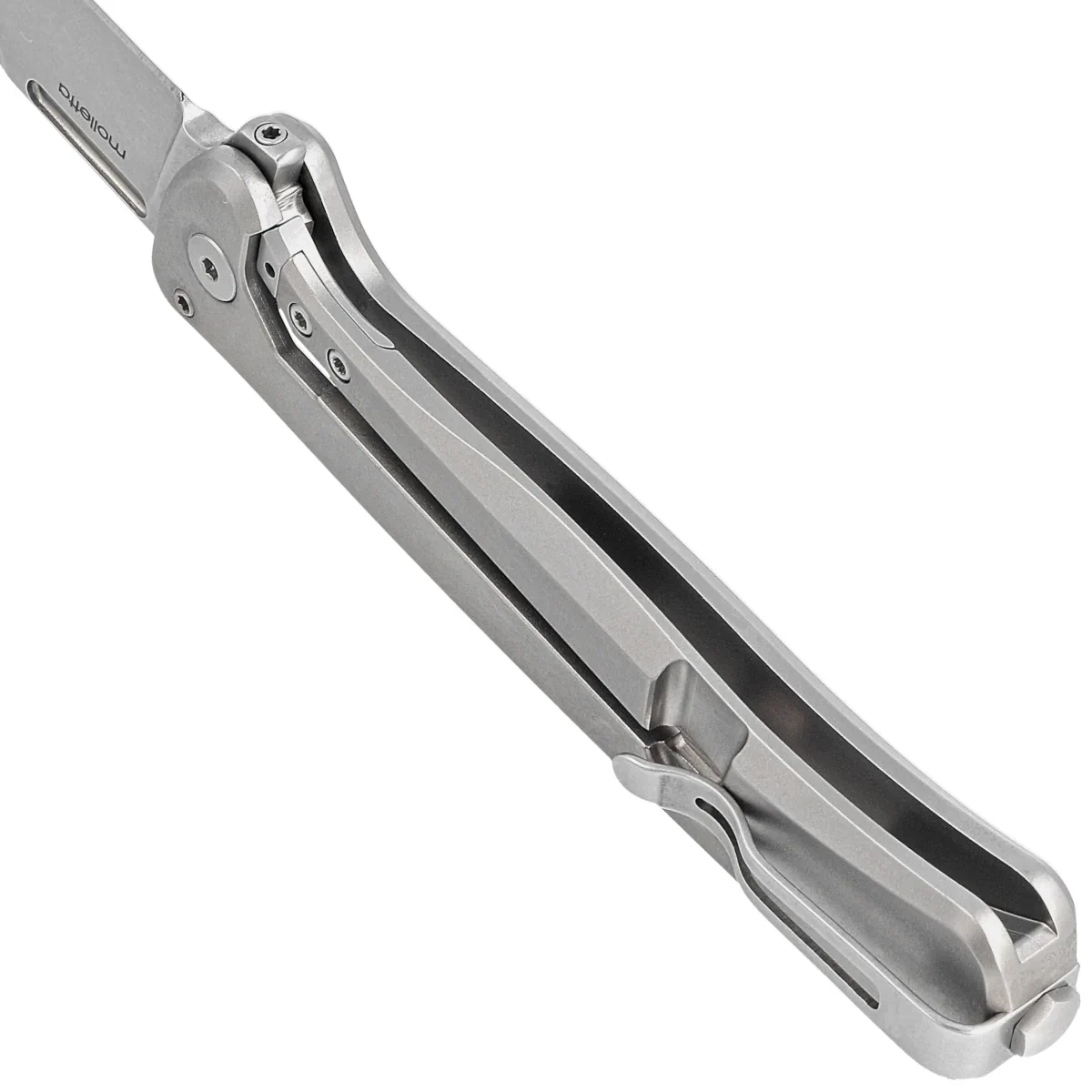 Blade - Drop Point finished with a scratch-masking bath of fine Stonewashed pebbles. Plain blade brought out with a Flat Grind which gives excellent cutting edge geometry and extreme cutting performance. Frame-Lock reinforced, monolithic 6AI4V titanium blade lock with a steel inlay to prevent wiping of the lock face. Located on the underside of the blade, the IKBS-assisted protrusion / flipper makes it easy to open the blade. In the open position it serves as a lower guard / hilt protecting the hand from slipping off the handle. In the upper part, the characteristic milling used to open the knife with the Flipper removed.