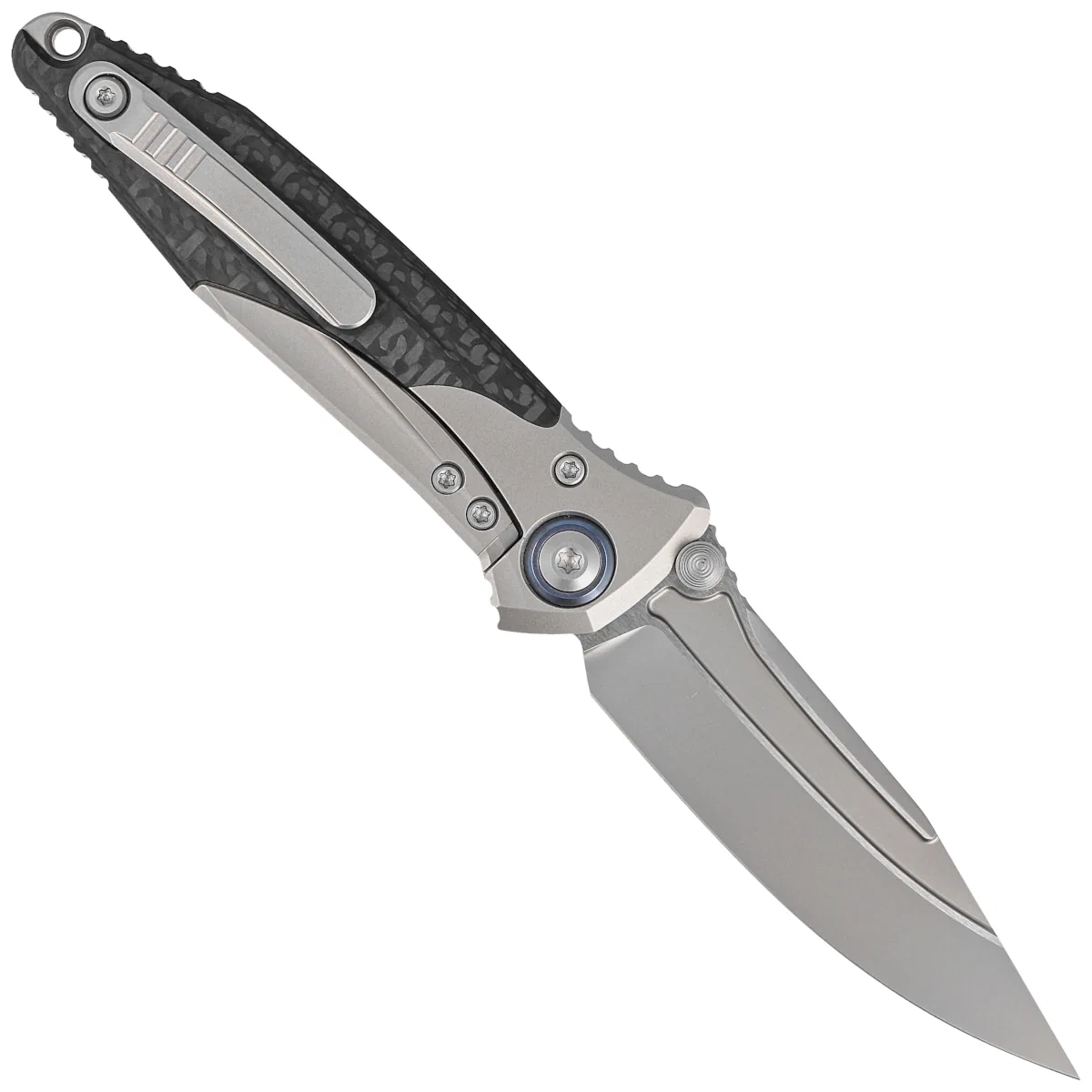 Handle - made with perfect precision in 3D technology on CNC milling machines from titanium. Perfectly fitted inlays (inlay) of Carbon Fiber composite make the knife does not slip in the hand during use. There are notches (jimping) on the back of the Handle for a more secure grip. The ergonomic profile and milled single-position (right) solid clip, allow the knife to be carried discreetly in the pocket, in tip-up(blade tip up) position. The pivot axis decorated with a blue rim (pivot collar cap). In the back there is a lanyard hole, a place for a safety or decorative cord. The protruding section of the titanium frame can be used as an improvised glass breaker.