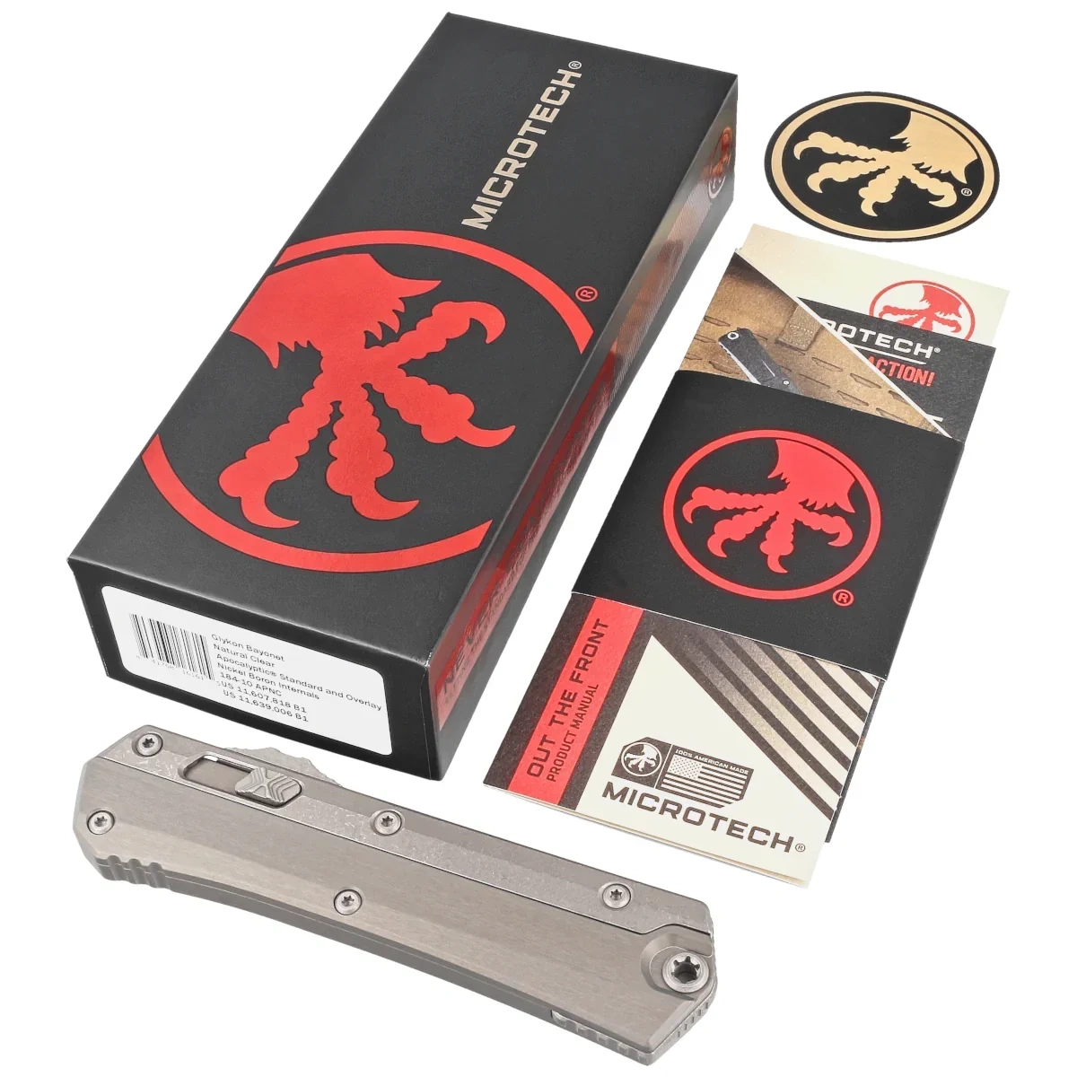 Glykon Natural Clear Aluminum/Apocalyptic Titanium, Apocalyptic is a large OTF (Out The Front) automatic knife from the Glykon series. The first OTF automatic with a three-way button for full ambidextrous operation, it features a hell of a fast mechanism that extends a razor-sharp blade. 100% made and assembled in the USA. Designed by Anthony and Sean Marfione of Microtech Knives.