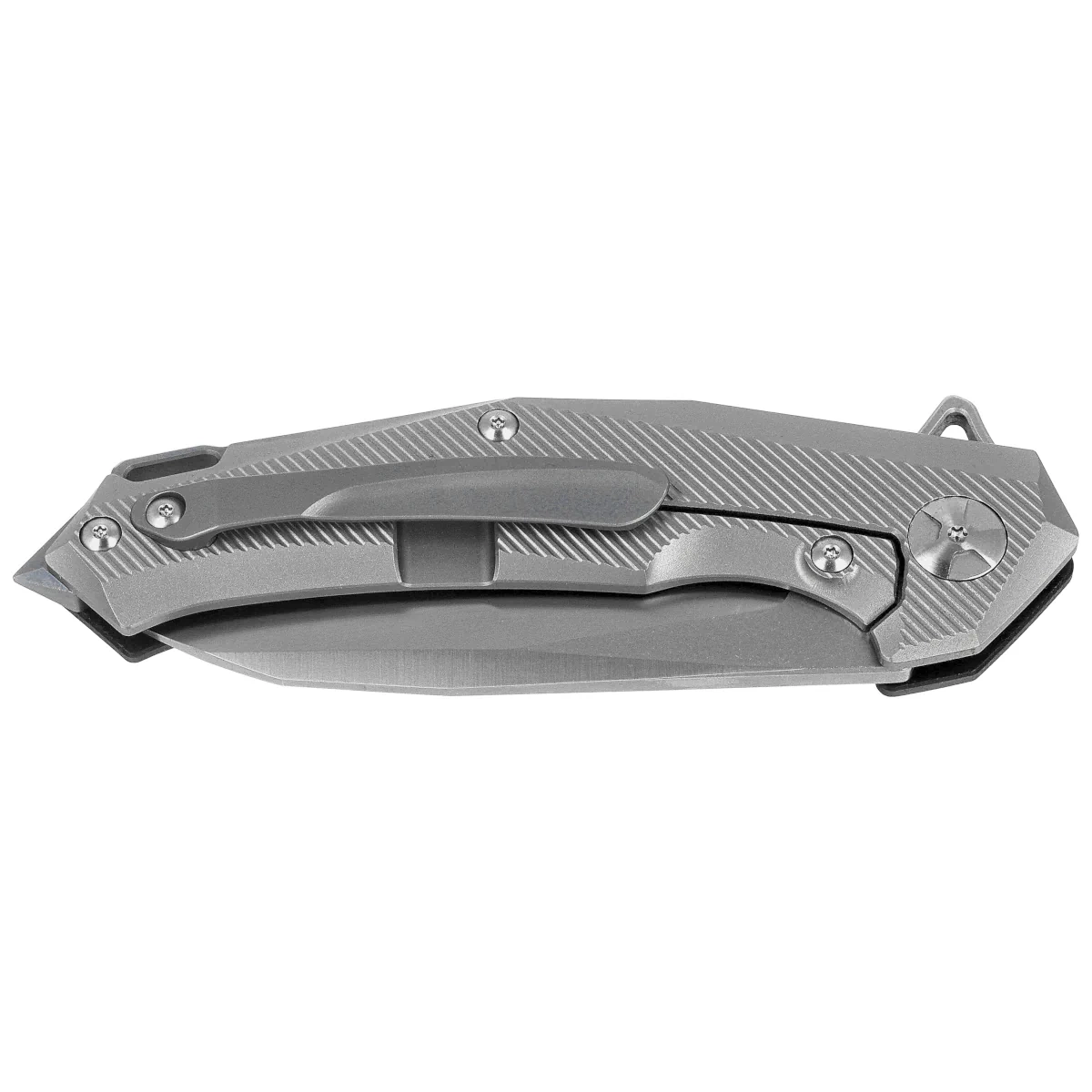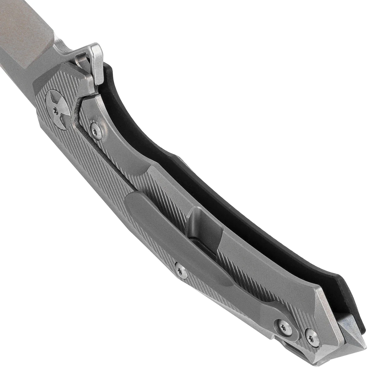 Handle - presentation side made of G10 composite , practically indestructible plastic, insensitive to weather conditions, resistant to chemicals and mechanical damage. Lock side made of titanium. The chamfered edges of the covers eliminate sharp edges for convenience, and the finger undercut made on the front improves ergonomics. The backspacer to which the grips are attached guarantees the rigidity and strength of the entire structure. A single-position (right) deep-carry clip allows you to carry the knife discreetly in your pocket in tip-up position (with the tip of the blade upward). In the protruding part of the backspacer lanyard hole, a hole for a decorative or belaying rope. In the backspacer a glass striker, which can also be used for self-defense.
