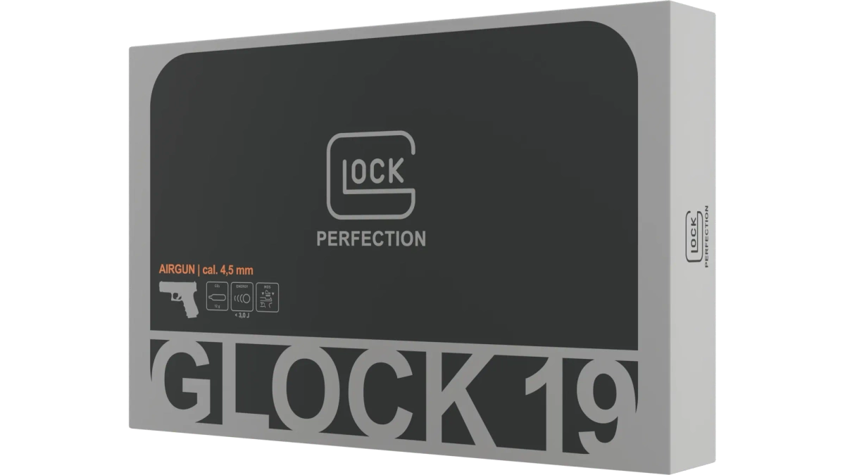 - Glock 19 MOS Gen 4, cal. 4.5 mm – air gun with a metal slide, NBB system, speed of 120 m/s, MOS collimators and a 16 BB magazine.