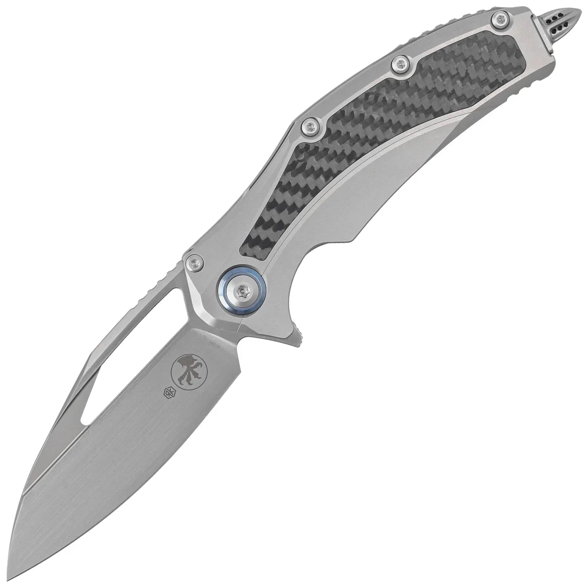 Handle - made with perfect precision in 3D technology on CNC milling machines from titanium. Perfectly fitted inlays (inlay) of Carbon Fiber composite make the knife does not slip in the hand during use. There are notches (jimping) on the back of the Handle for a more secure grip. Ergonomic profile and titanium milled single-position pocket clip for carrying the knife in tip-up(blade tip up) position. Equipped with a smooth rollerball, which allows the knife to slide easily into a pocket without damaging the edges. Mounted on the Handle with a massive glass breaker made of tungsten. The pivot axis decorated with a blue rim (pivot collar cap).
