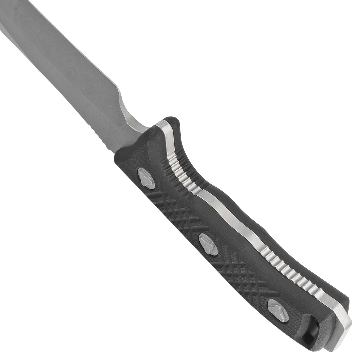 Handle - profiled with finger notches. Grips made of G10 plastic attached directly to the blade with proprietary Microtech screws. This is the simplest and most secure design that ensures the practical indestructibility of the knife. The advantage of G10 is the extraordinary strength of the material combined with almost complete insensitivity to weather conditions. Handle covered along its entire length with notches (jimping) which reinforces the certainty of the grip and control over the knife while working. The protruding section of the tang can be used as a glass breaker, and also includes a lanyard hole, a hole for a belaying or decorative rope.