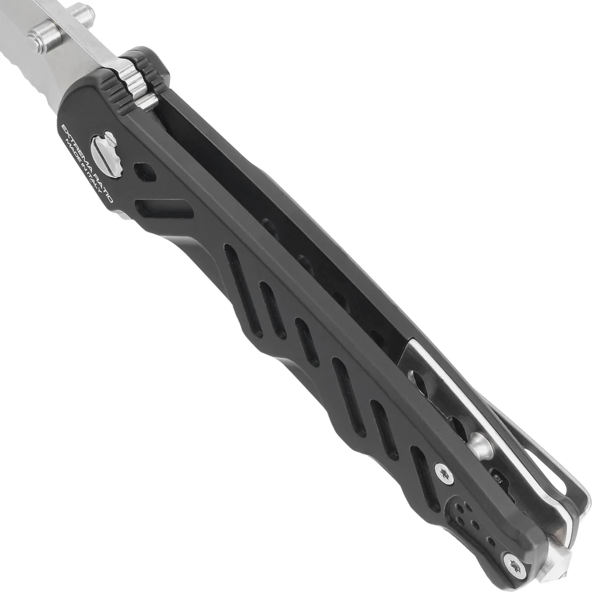 Blade - extremely sharp with Spear Point profile, 4 mm thick with clearly marked blade belly. It's made of well-sharpened, durable N690 high-cobalt stainless steel and finished with an elegant satin finish. The Combo type blade is derived with a Flat grind which provides strength, excellent cutting edge geometry and extreme cutting performance. The serrated part of the edge allows cutting very tough cables and fabrics without losing the sharpness of the rest of the blade. Dual blade locking system: a robust Liner-Lock blade locking mechanism, is combined with an additional manual lock. A false blade is brought out on the back of the blade for improved piercing properties, in addition, at the very tip the blade is double-edged. The protruding flipper lever, when opened, forms a guard to prevent the hand from slipping on the blade.