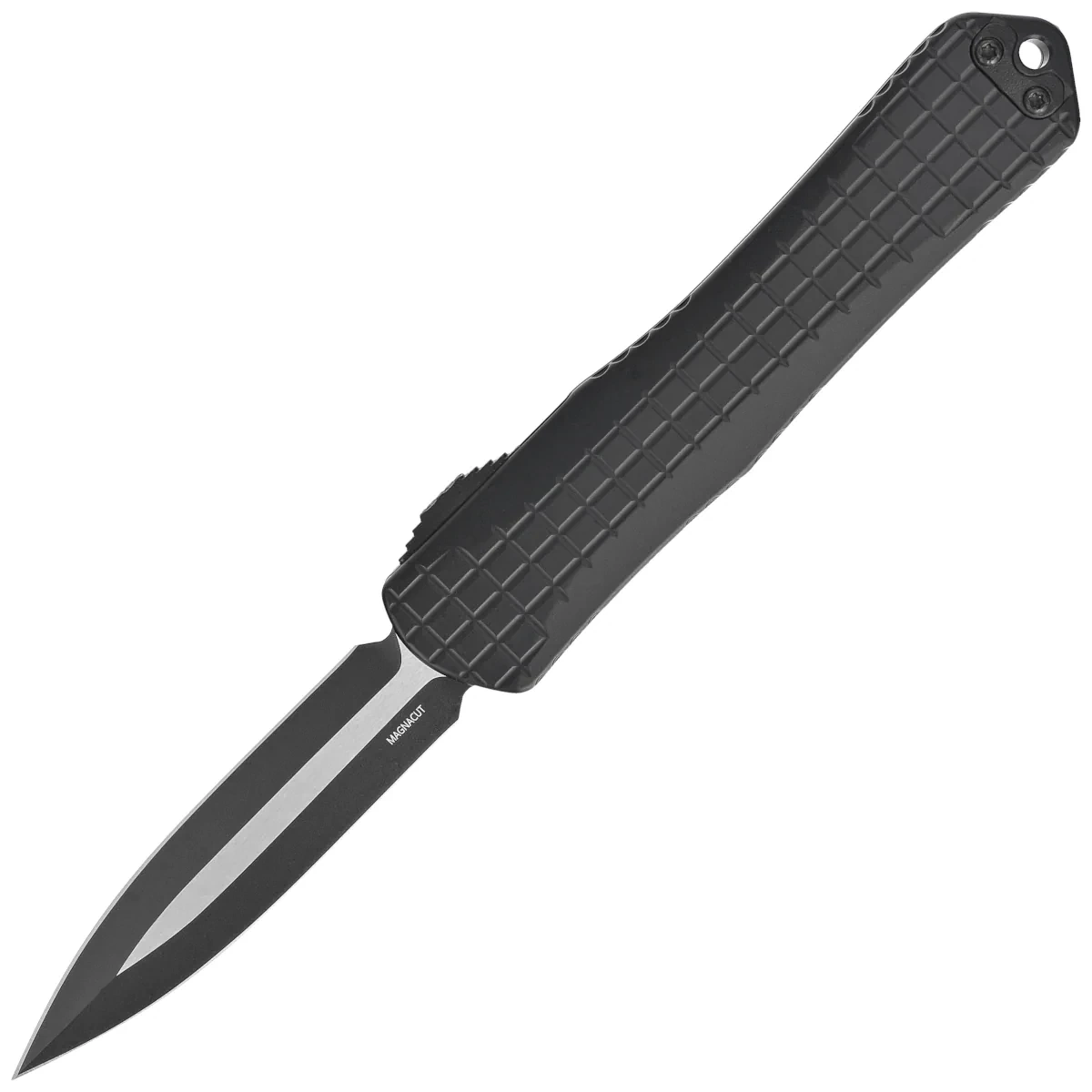 Blade - machine ground D/E (Double Edge Dagger) type with a double-edged symmetrical blade. The blade with an elegant Two Tone finish, black coated grinds, the rest of the blade satin-finished, brought out with a high flat grind (Flat Grind), providing excellent cutting properties. As a result, while maintaining high strength, the knife has excellent piercing properties. The strong mechanism of extending / retracting the blade with the help of a moled Thumb Slide, a stepped slide, requires for safety the application of a specific force to overcome the resistance of the spring. The method of opening provides seamless opening for both right and left-handed people.