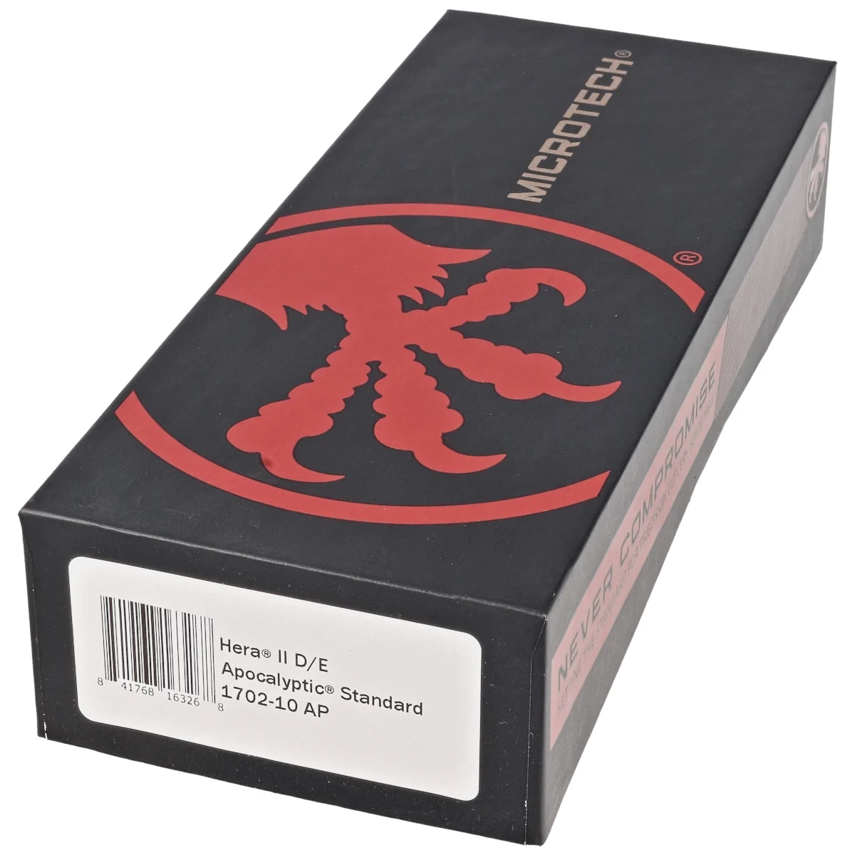 Hera II D/E Black Aluminum, Apocalyptic one of the most versatile OTF (Out The Front) automatic knives. Inspired by the iconic Troodon, it bridges the gap between EDC models and fully tactical designs. The exceptionally durable D/A (Double Action) mechanism provides fast, powerful, and reliable blade deployment and retraction. The knife stands out with its excellent fit, finish, and overall build quality. A design by Anthony Marfione, renowned knifemaker and owner of Microtech Knives.