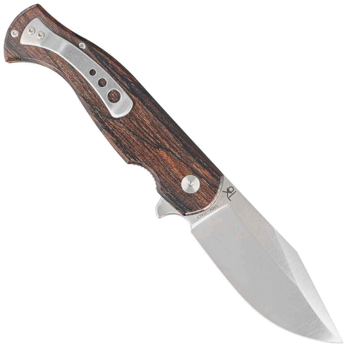 Handle - made of olive wood, extremely hard and resistant to mechanical damage. Chamfered edges of the covers eliminate sharp edges, and the fore finger groove made on the front improves grip security. The grips are screwed to an intricately machined aluminum backspacer, give you the assurance of many years of use. An upper jimping, notched palm rest has been made along the entire length of the backspacer. A single-position (right) steel deep-carry clip allows you to carry the knife discreetly in your pocket in tip-up (blade tip up) position. Hidden lanyard hole in the back, a hole for threading a safety or decorative cord.