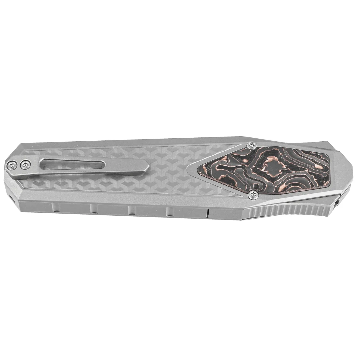 Handle - made on CNC milling machines from titanium, with three-dimensional texture. The chamfered edges of the covers eliminate sharp edges, and the perfectly matched Carbon Fiber composite inlay (inlay) with copper strands add an exclusive touch and improve grip security. On the right side, an artful slide for advancing/retracting the blade. A single-position titanium (right) deep-carry clip allows the knife to be carried discreetly in a pocket in tip-down position (blade tip down).