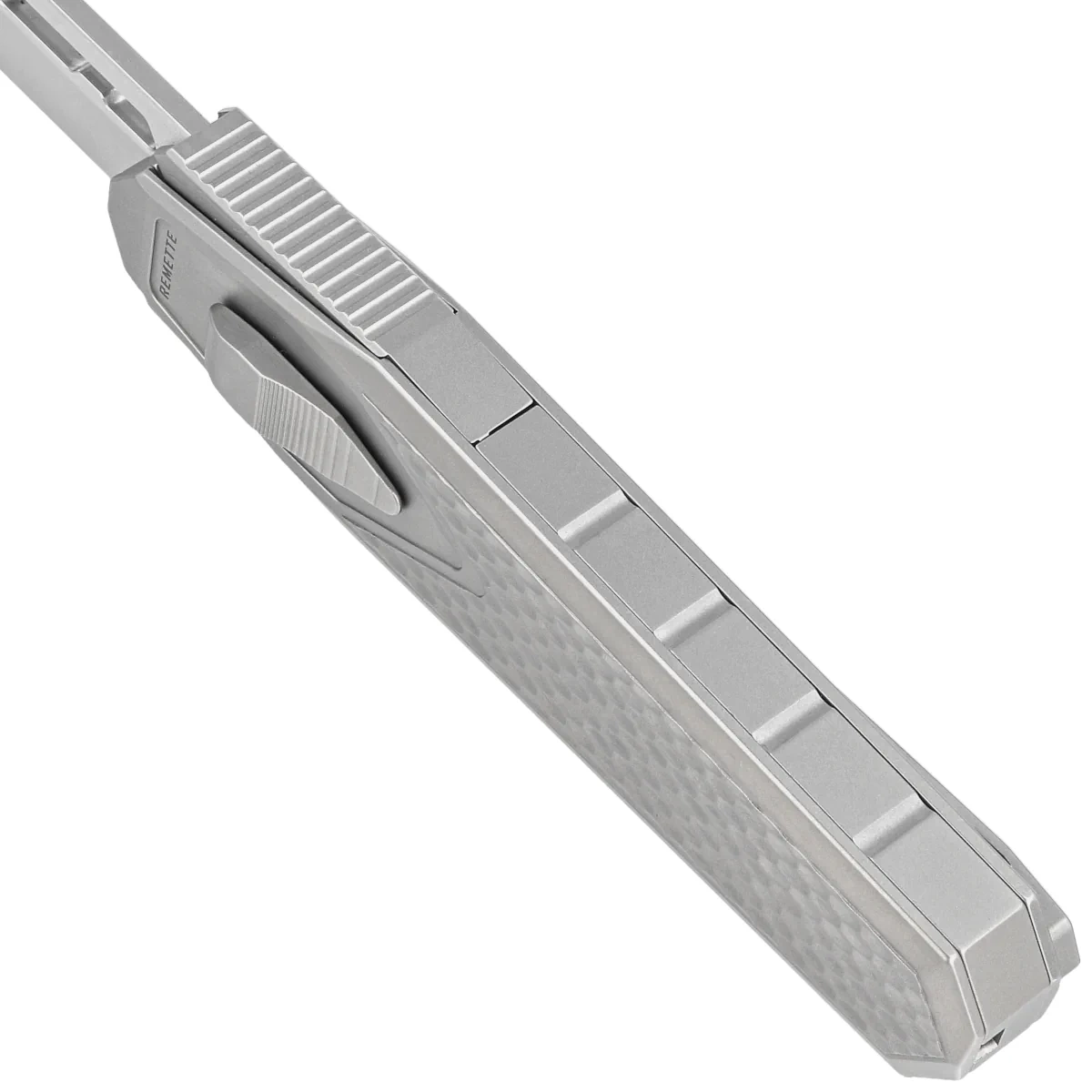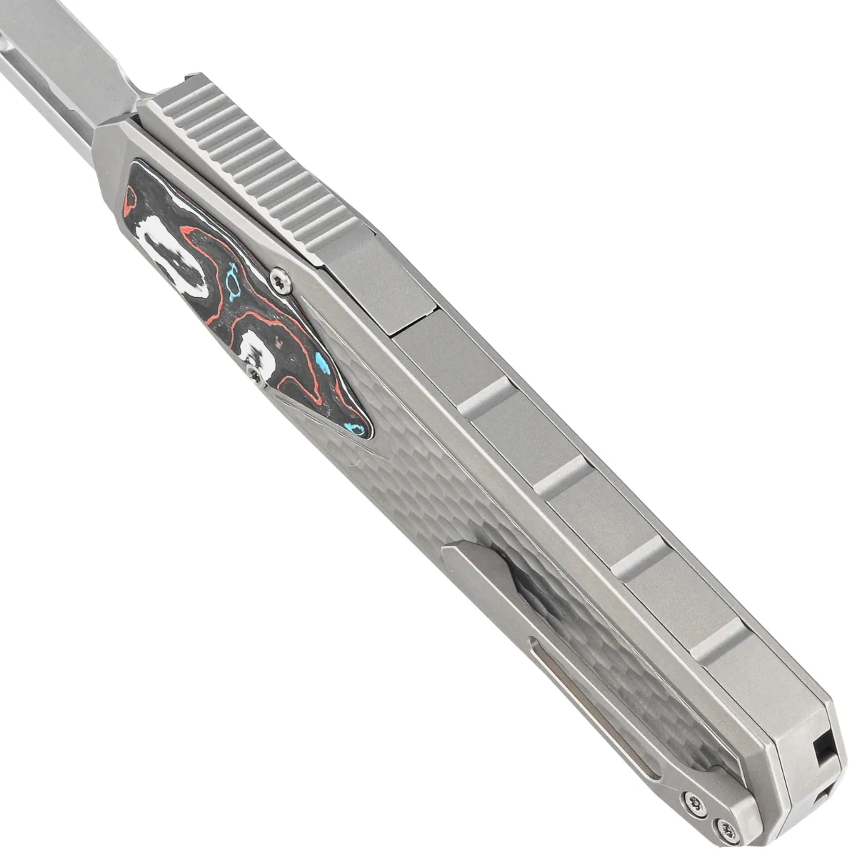 Swordfish Titanium / Carbon Fiber, Pearlescent opening intuitive folding knife from the up-and-coming Remette Knives manufactory, a display of engineering in design. Gravity OTF (Out The Front) Blade extends from the front due to the force of gravity. Modeled on the design of the Luftwaffe gravity air knife, commonly known as the knife of German paratroopers. Intuitive extension / retraction of the blade with one hand (under the influence of gravity) and the best materials such as Böhler M390 blade steel and titanium handle, perfectly combined with the unmatched quality of the Remette brand !