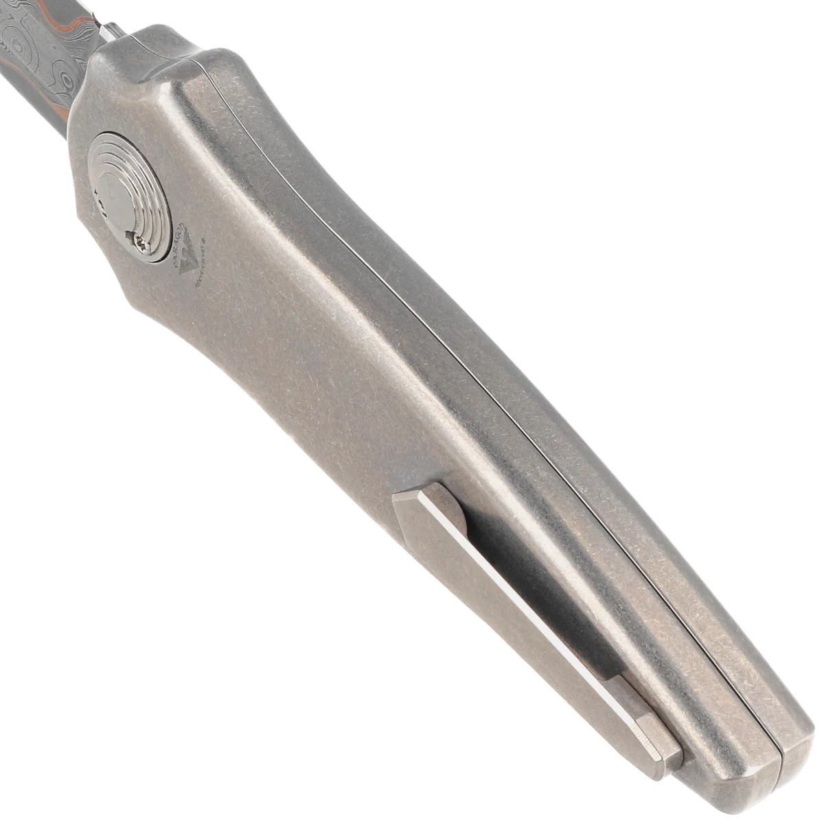 Warlock Smooth Gray Titanium, Damascus Baker Forge Raindrop Gomai Copper Shim 80CRV differs from traditional folding knives by using an innovative opening mechanism. The large, textured pivot serves as a double locking button. By pressing both sides of the pivot at the same time, the Handle splits, exposing the Blade; through gravity and wrist movement, the Blade will slide out to the open position. This is a fun and innovative opening mechanism, effective and also provides a solid lock. The Warlock knows how to get down to business and will work as long as you want it to, but it's also capable of satisfying your thirst for fun. It's a knife you'll always be happy to have with you.