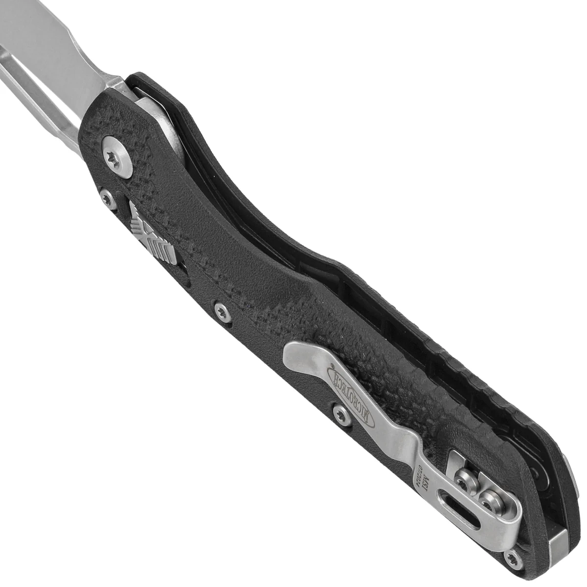 Handle - made of durable polymer, covered with Tri-Grip texture for better grip. Wide locking slide with Microtech's characteristic stepped X structure. Both grips are bolted together with a solid aluminum backspacer. The double-sided (right / left) clip allows you to discreetly carry the knife in tip-up position. Above the clip a lanyard hole, a place for a safety or decorative cord.
