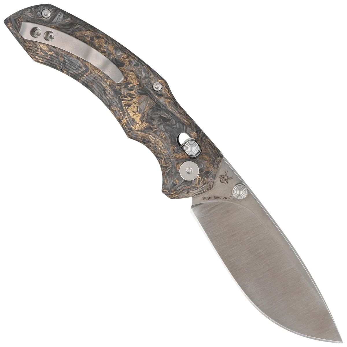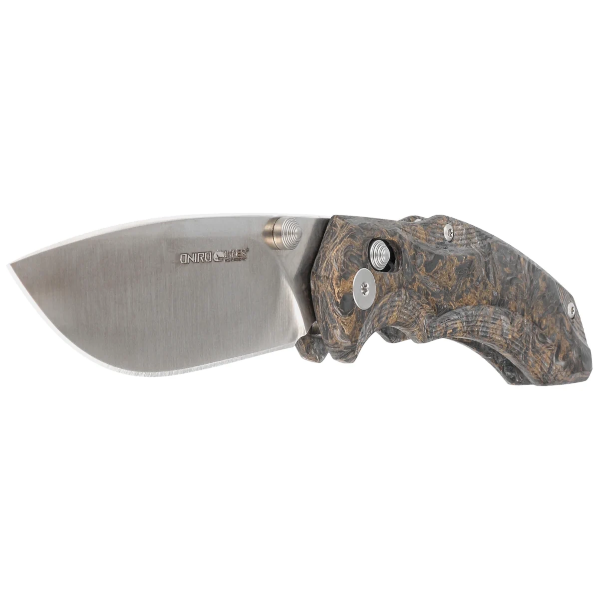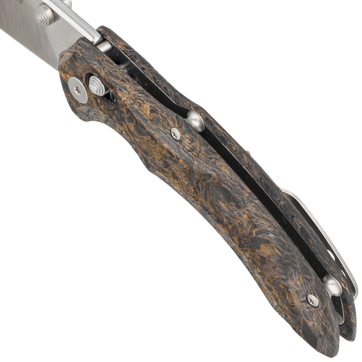 Handle - made of Dark Matter Gold Carbon Fiber composite, a practically indestructible plastic that is insensitive to weather, resistant to chemicals and mechanical damage, beautifully milled using CNC machine tools. The open-backed design, fixed with steel spacer sleeves, reduces weight and facilitates cleaning. The simple, secure design gives you the assurance of many years of use. Single-position clip (right), made of titanium, allows the knife to be carried in tip-up position.