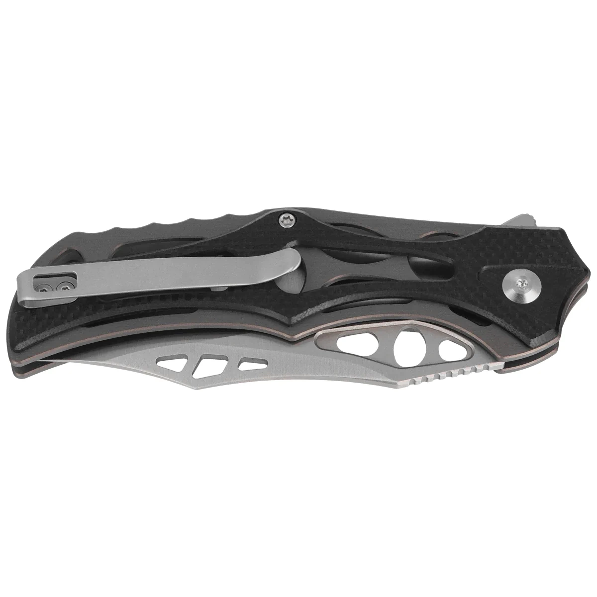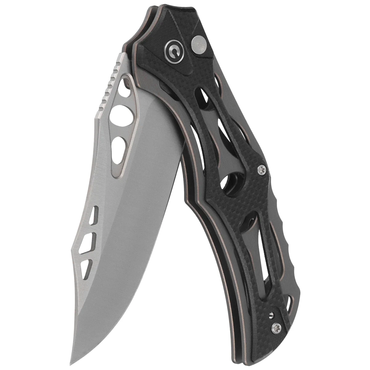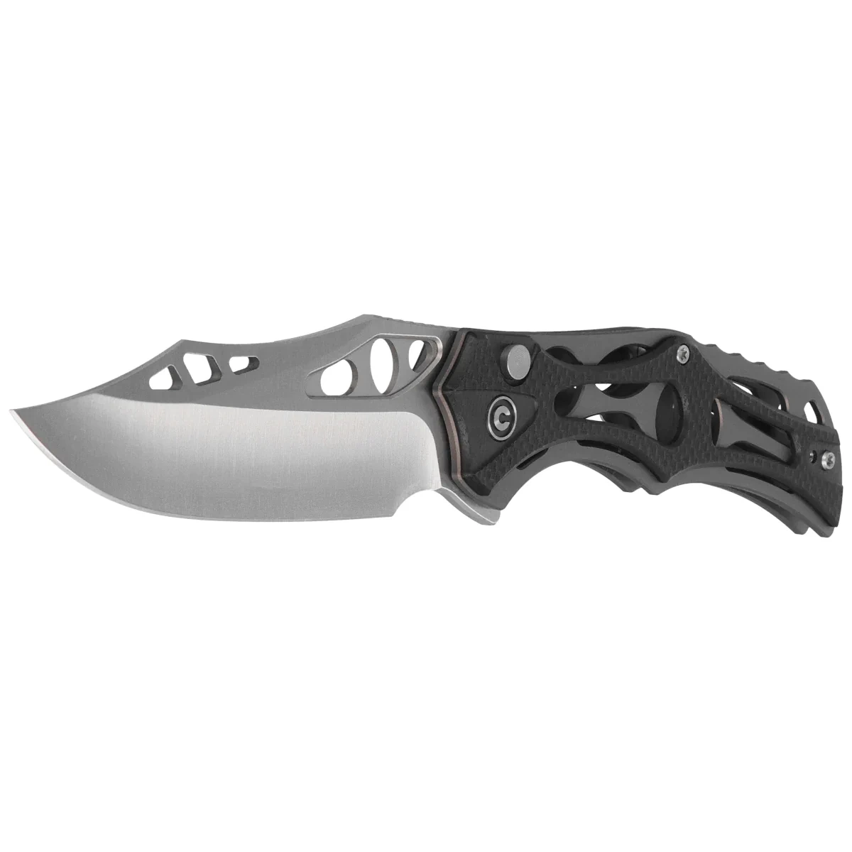 Handle - skeletonized, made of aluminum, to which heavily cut G10 composite grips were screwed. This gives the fingers plenty of support points for a secure grip. A fore finger groove made at the front improves ergonomics. The open-backed design, fixed with steel spacer sleeves, reduces weight and facilitates cleaning. The simple, secure design gives assurance of many years of use. Thanks to all these design measures, the full-size folder reaches a staggering 75g in weight. The pivot axis is adorned with a stylized Civivi brand logo . The two-position (right/left), deep-carry clip allows you to carry the knife discreetly in your pocket in tip-up position (blade tip up).