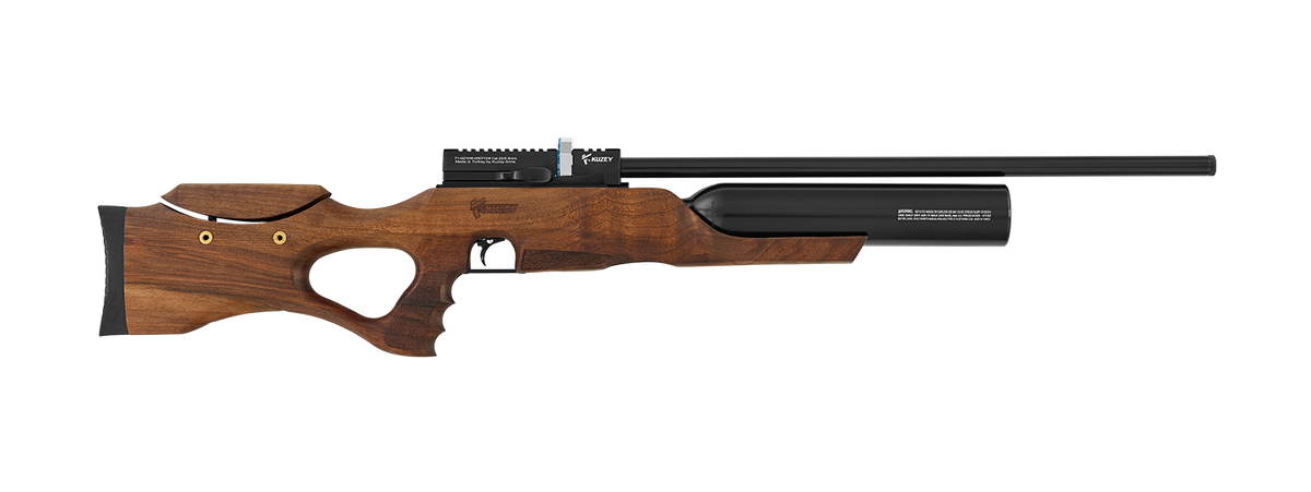 • Kuzey K900 6.35 mm – modern PCP air rifle with an integrated silencer, 500 cc high-capacity air cylinder, and adjustable shot power. Turkish walnut wooden stock with adjustable cheekpiece. Available in calibers 4.5 mm, 5.5 mm, and 6.35 mm.
