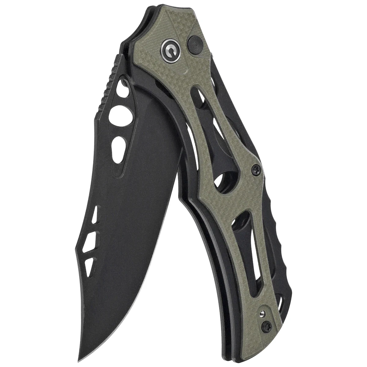 Handle - skeletonized, made of aluminum, to which heavily cut G10 composite grips were screwed . This gives the fingers plenty of support points for a secure grip. A fore finger groove made at the front improves ergonomics. The open-backed design, fixed with steel spacer sleeves, reduces weight and facilitates cleaning. The simple, secure design gives assurance of many years of use. Thanks to all these design measures, the full-size folder reaches a staggering 75g in weight. The pivot axis is adorned with a stylized Civivi brand logo . The two-position (right/left), deep-carry clip allows you to carry the knife discreetly in your pocket in tip-up position (blade tip up).