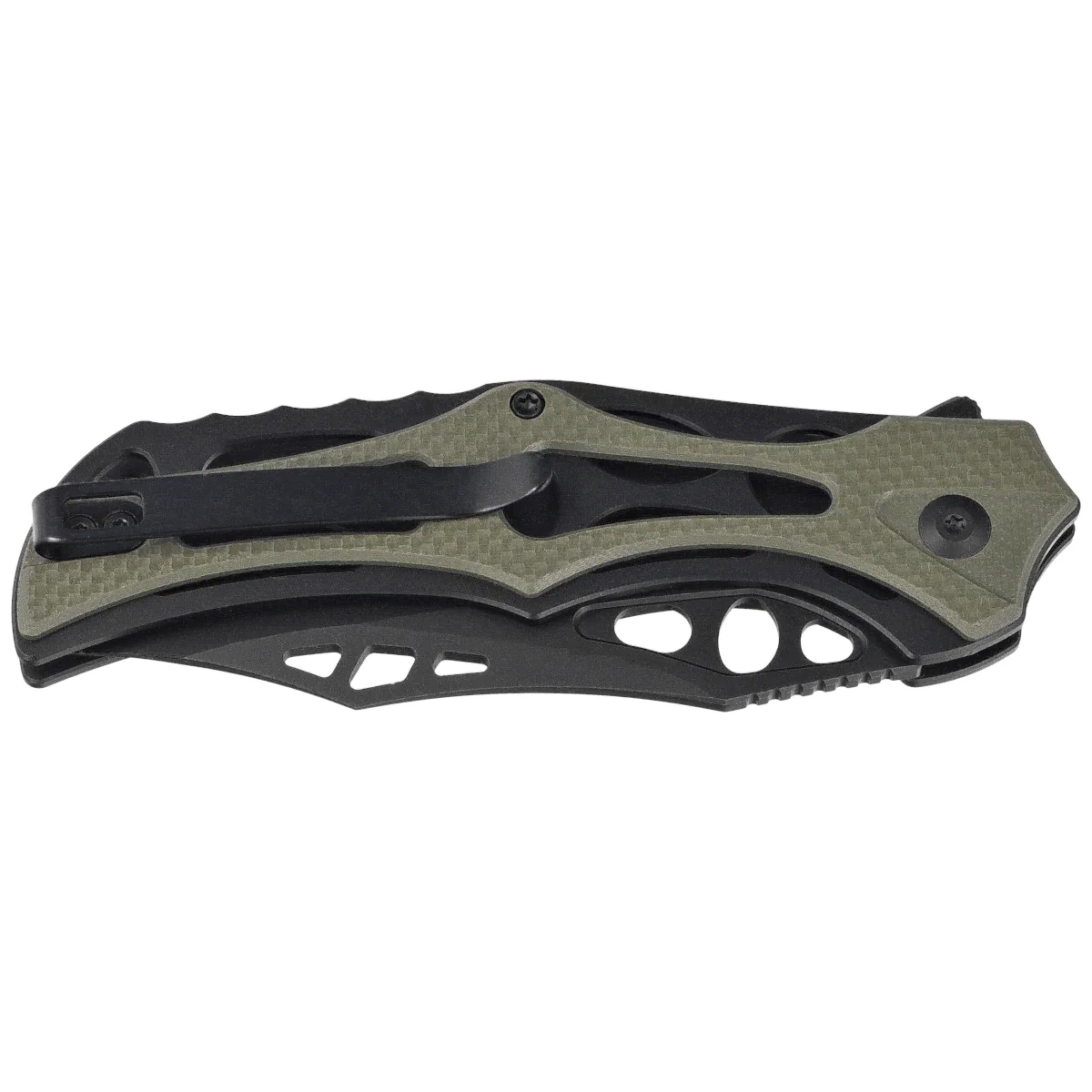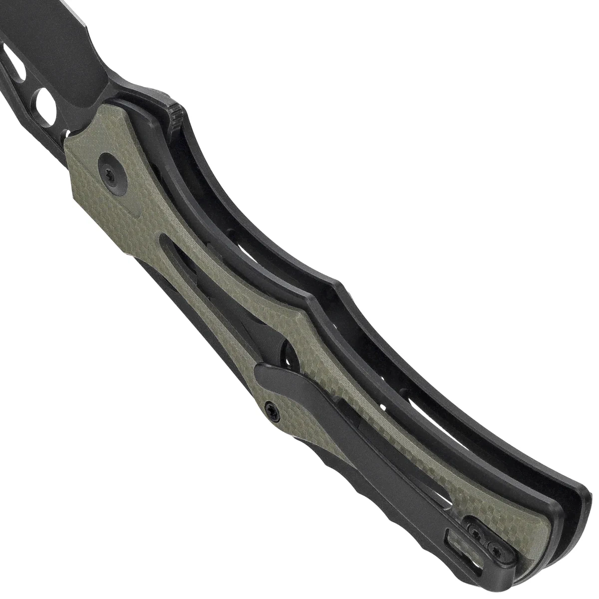- Biophase Black Aluminum / OD Green G10, Black Stonewashed large all-purpose folding knife with avant-garde styling. Nitro-V stainless steel head, skeletonized aluminum and G10 composite liners. Extremely secure grip!